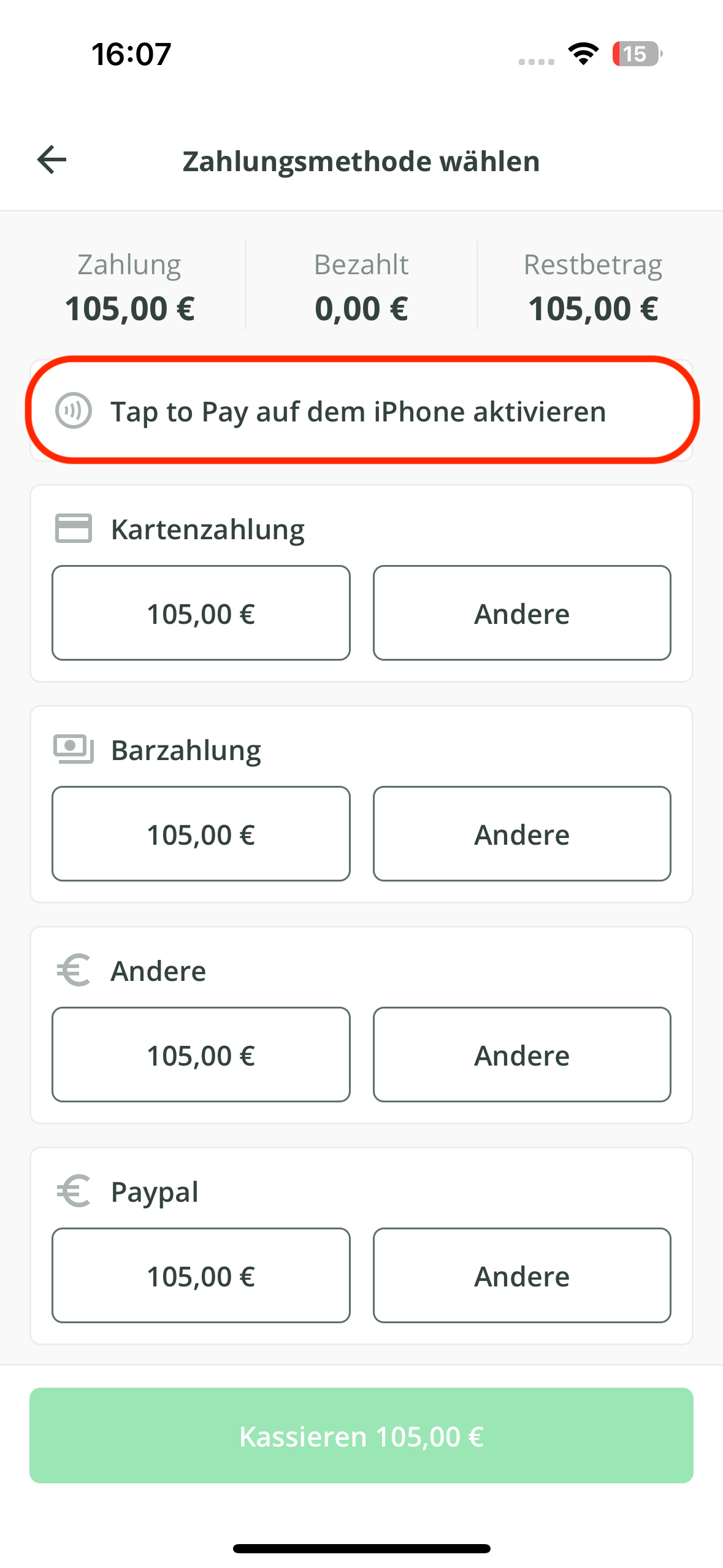 - Sobald Sie Tap to Pay erfolgreich auf Ihrem Gerät aktiviert haben, können Sie mit dem Kassieren loslegen. Gehen Sie hierfür wie folgt vor: