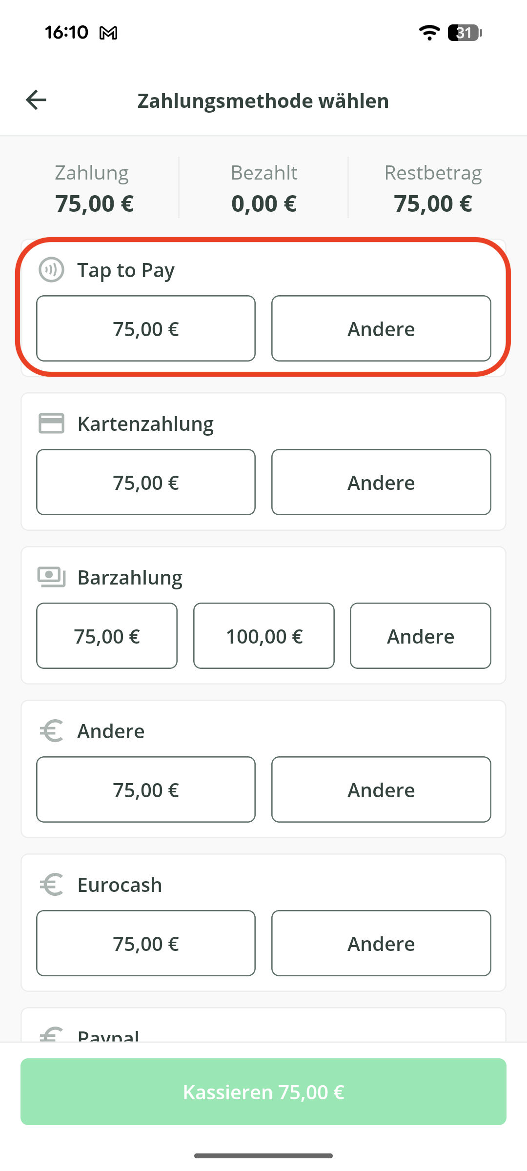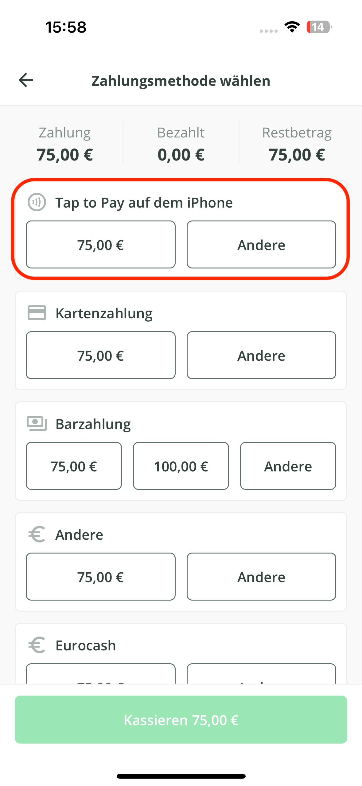 - Klicken Sie am Ende des Termins für die Zahlungsmethode Tap to Pay auf den passenden Betrag