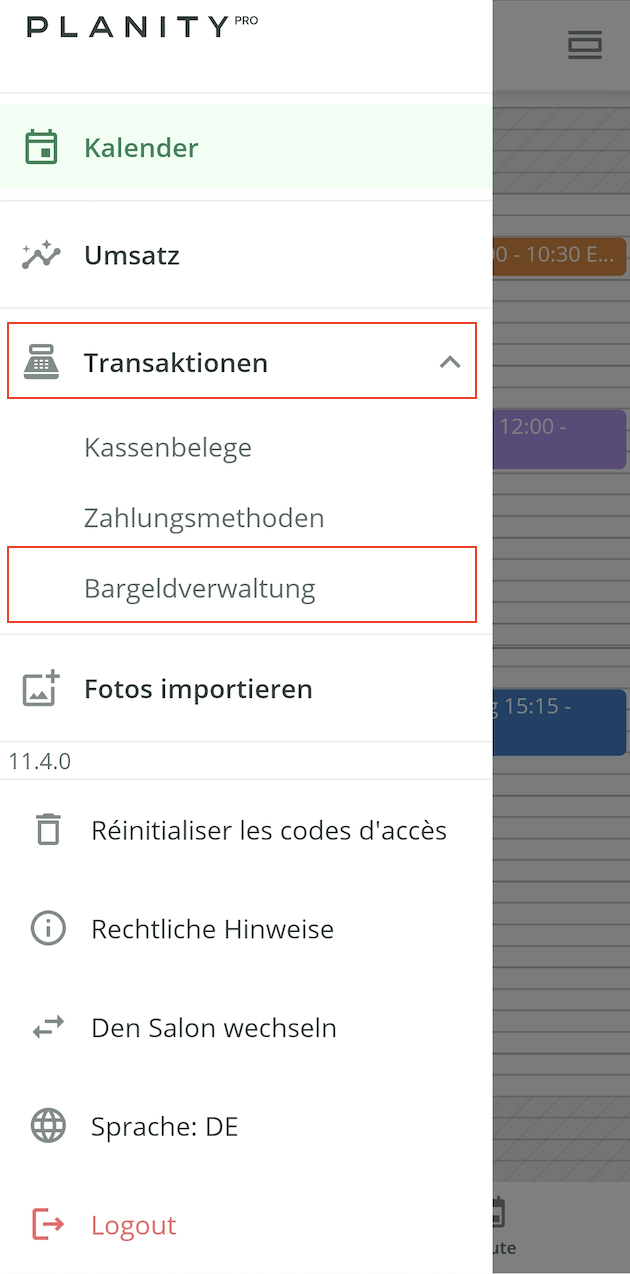 Um Ihre Kassensitzungen wie im Web und auf dem Tablet zu verwalten, klicken Sie über den Kalender oben links ins Hauptmenü und anschließend auf Transaktionen > Bargeldverwaltung: