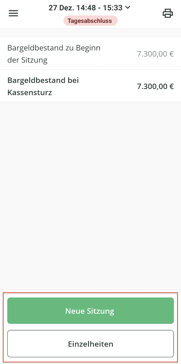 Klicken Sie auf Neue Sitzung, um Ihre Kasse zu öffnen und klicken Sie auf Einzelheiten, wenn Sie alle Barein- und -auslagen der ausgewählten Sitzung einsehen möchten.