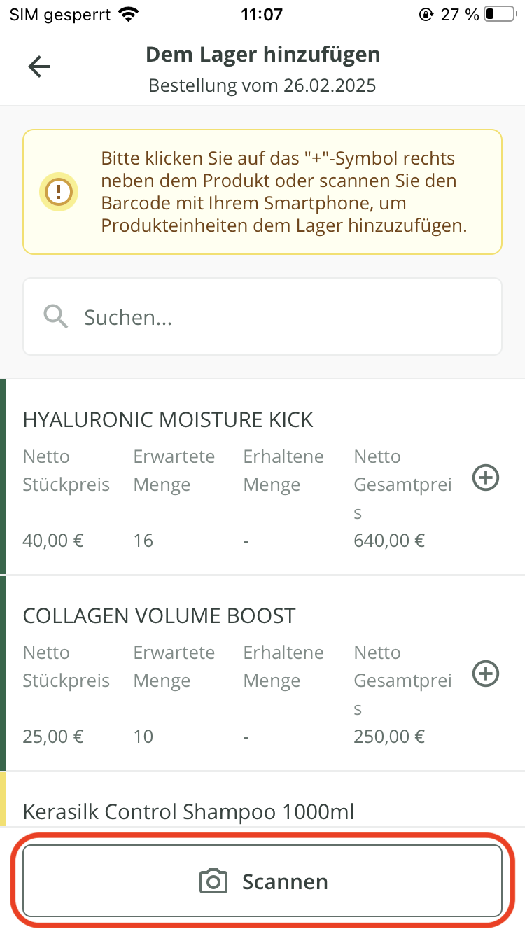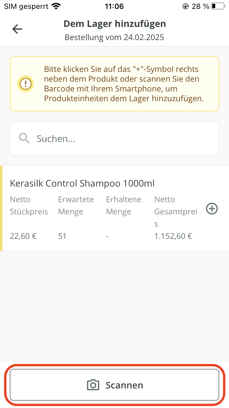 - Mit einem Klick auf Dem Lager hinzufügen können Sie den Barcode der erhaltenen Produkte mit Ihrer Smartphone Kamera scannen, um den Vorgang zu automatisieren