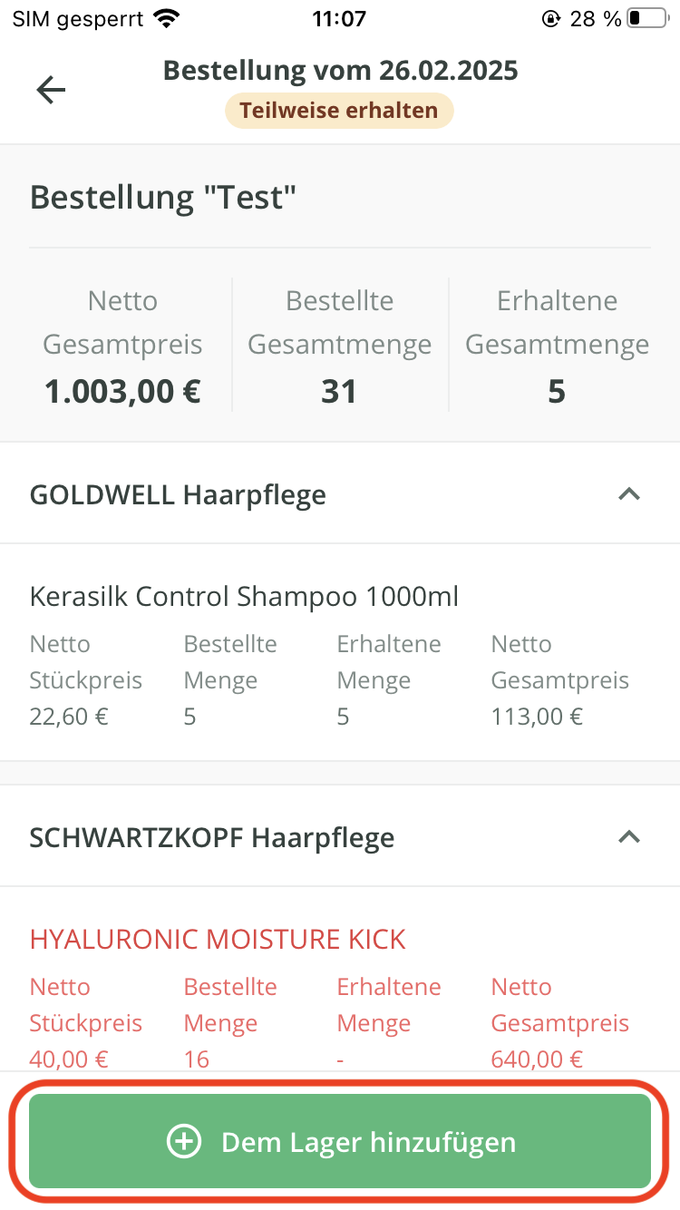 - Für eine teilweise erhaltene Bestellung können Sie die fehlenden Produkte Ihrem Lager hinzufügen, sobald diese bei Ihnen im Salon eingetroffen sind