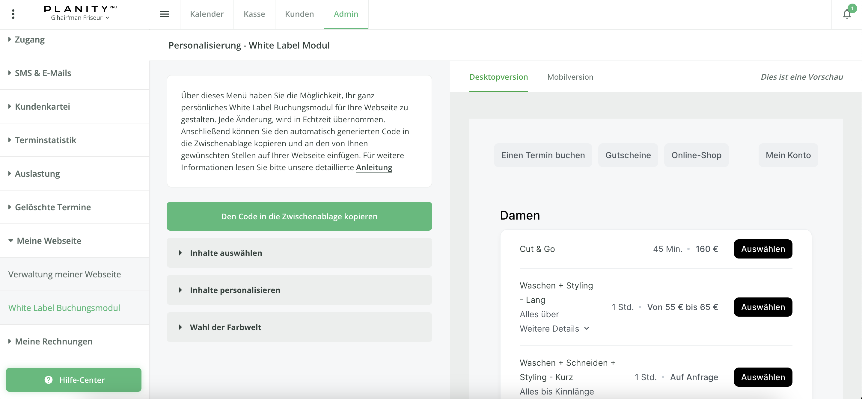 Ab sofort können Salons mit White Label Option ganz einfach selbst über die Planity Pro Web-App das Buchungsmodul für ihre Webseite gestalten und anschließend in ihre bestehende Webseite integrieren. Hierfür haben wir den Menüpunkt Personalisierung - White Label Modul hinzugefügt, den Sie unter Admin > Meine Webseite finden können. Der Menüpunkt ist ausschließlich für Kunden sichtbar, die die Planity White Label Option nutzen.