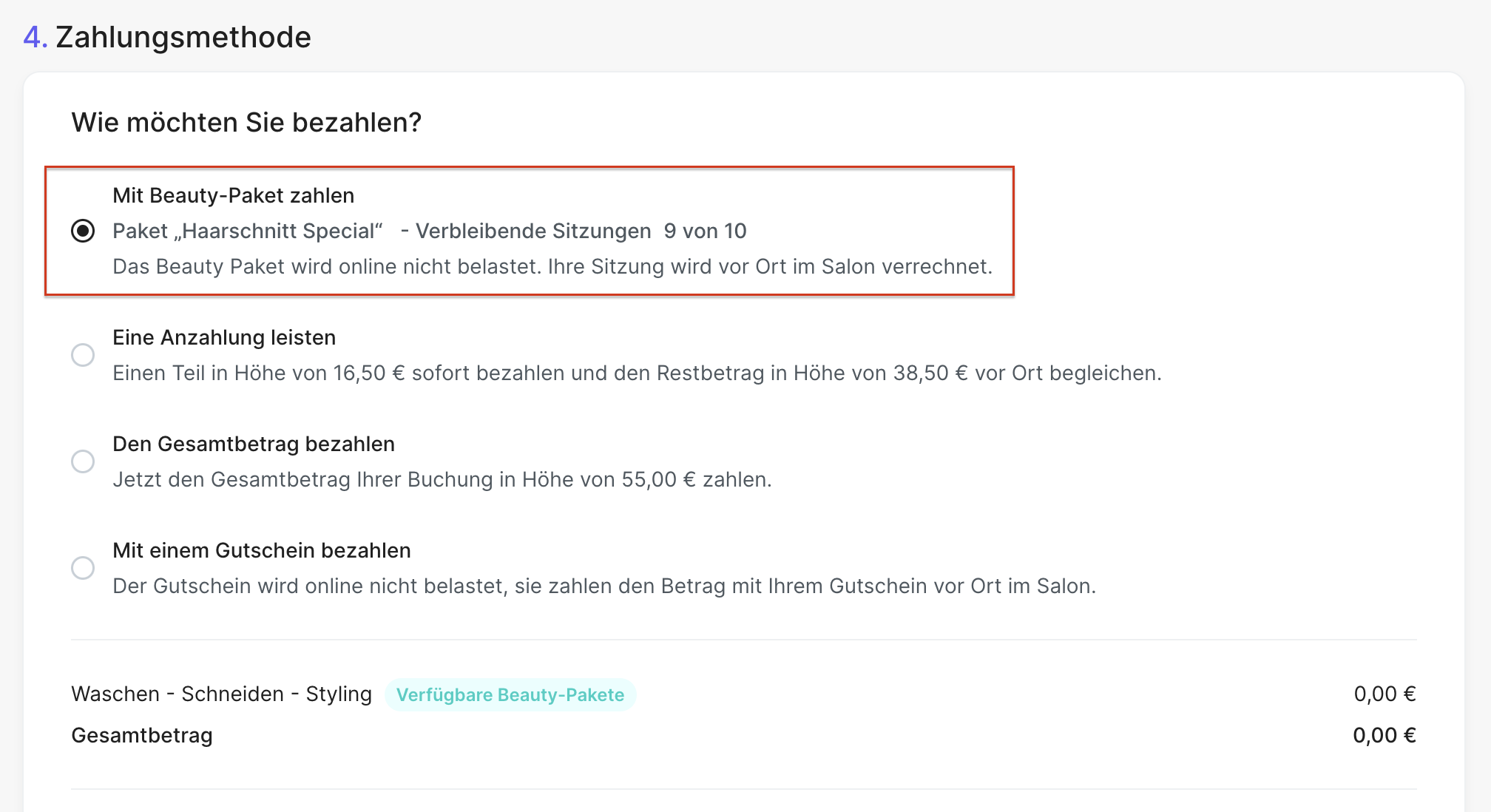- Die ausgewählte(n) Dienstleistung(en) müssen mit dem Beauty-Paket verknüpft sein