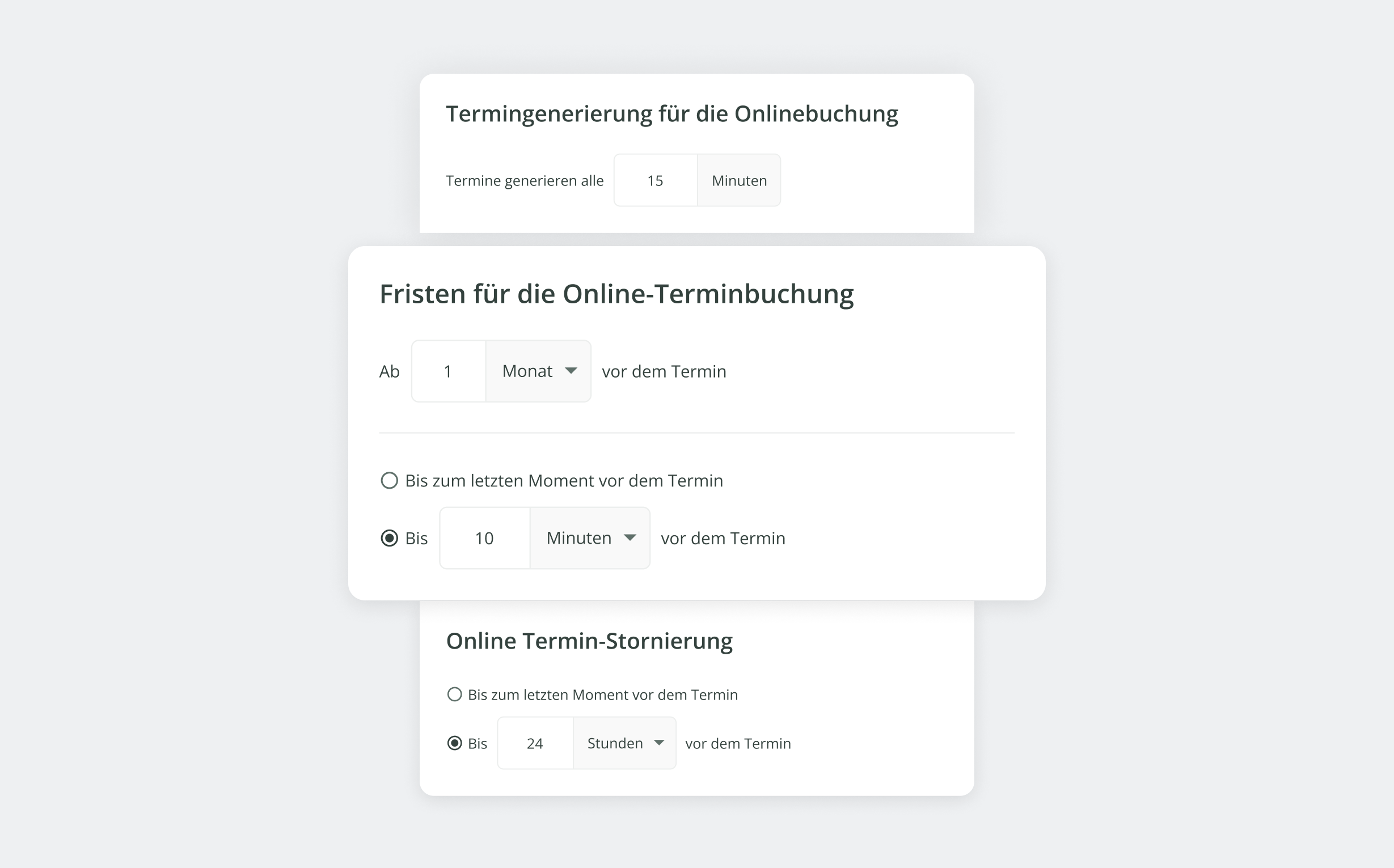 Sie können diese Einstellungen über das Menü Admin > Salon-Einstellungen > Verwaltung der Öffnungszeiten und Fristen > Fristen zur Buchung von Online-Terminen vornehmen.