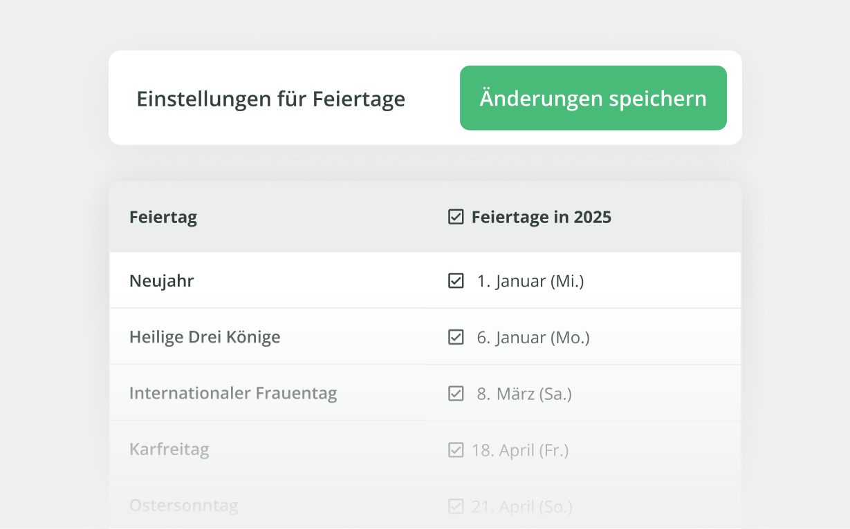 Ab sofort haben Sie mit Planity Pro (Web und Tablet) die Möglichkeit, Ihre Einstellungen für Feiertage für die nächsten drei Jahre vorzunehmen. Wählen Sie über das neue Menü (Admin > Salon Einstellungen > Verwaltung der Öffnungszeiten und Fristen) einfach diejenigen Feiertage aus, die für Ihr Bundesland relevant sind und blockieren Sie so automatisch die Online Terminbuchung für diese Tage.