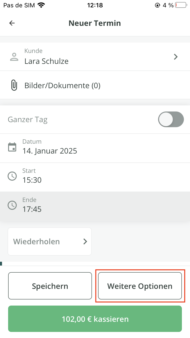 Ab sofort finden Sie in der Terminbox das Menü Weitere Optionen. Wie auf dem PC und auf dem Tablet kann dem Kassenbeleg über dieses Menü eine Dienstleistung, ein Produkt, ein Rabatt, ein Gutschein, ein Beauty Paket, ein weiterer Termin oder ein beliebiger Betrag hinzugefügt werden. Es ist ebenso möglich, Treuepunkte über dieses Menü einzulösen oder ein Produkt mit der Smartphone Kamera zu scannen.