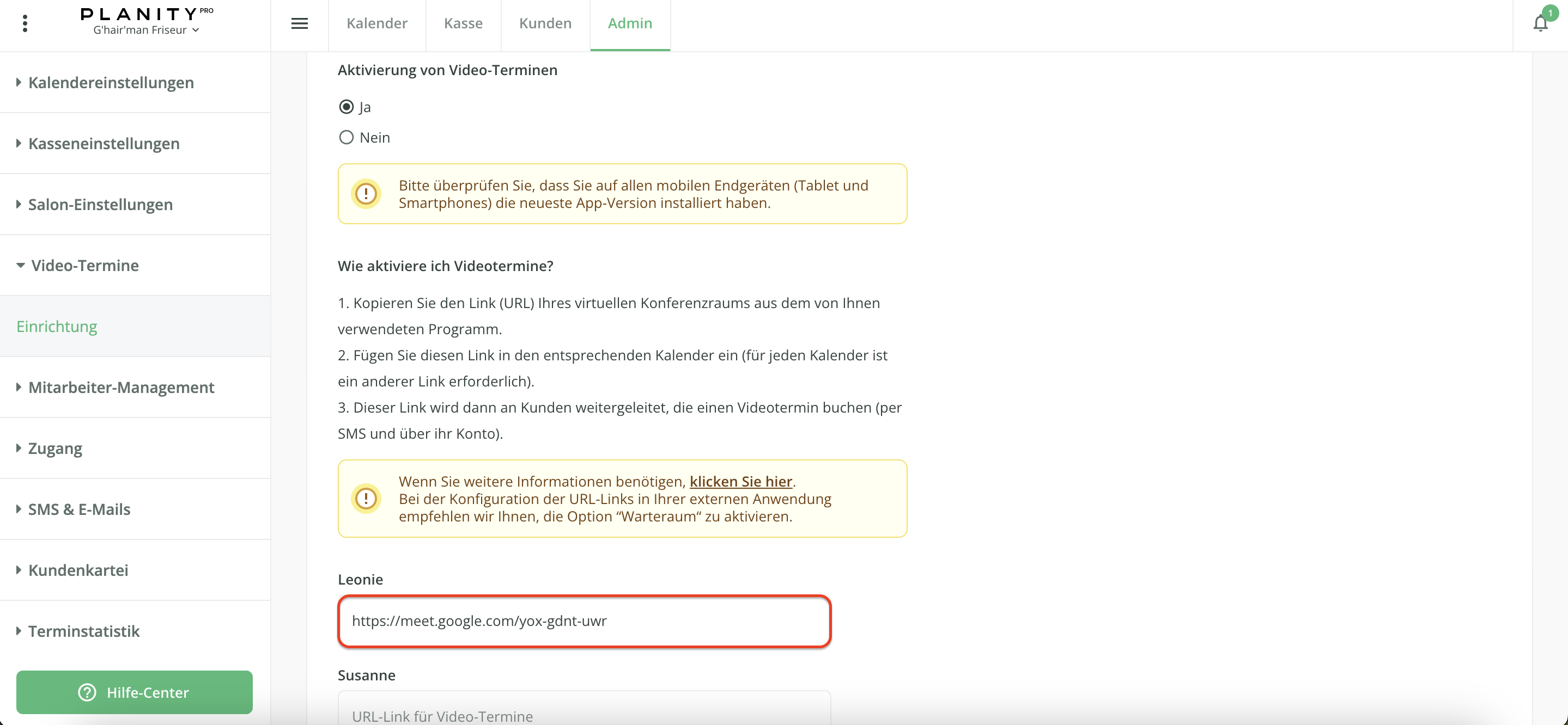 Tragen Sie in der Rubrik "Wie aktiviere ich Video-Termine" die URL-Links für Ihre Mitarbeiter ein.