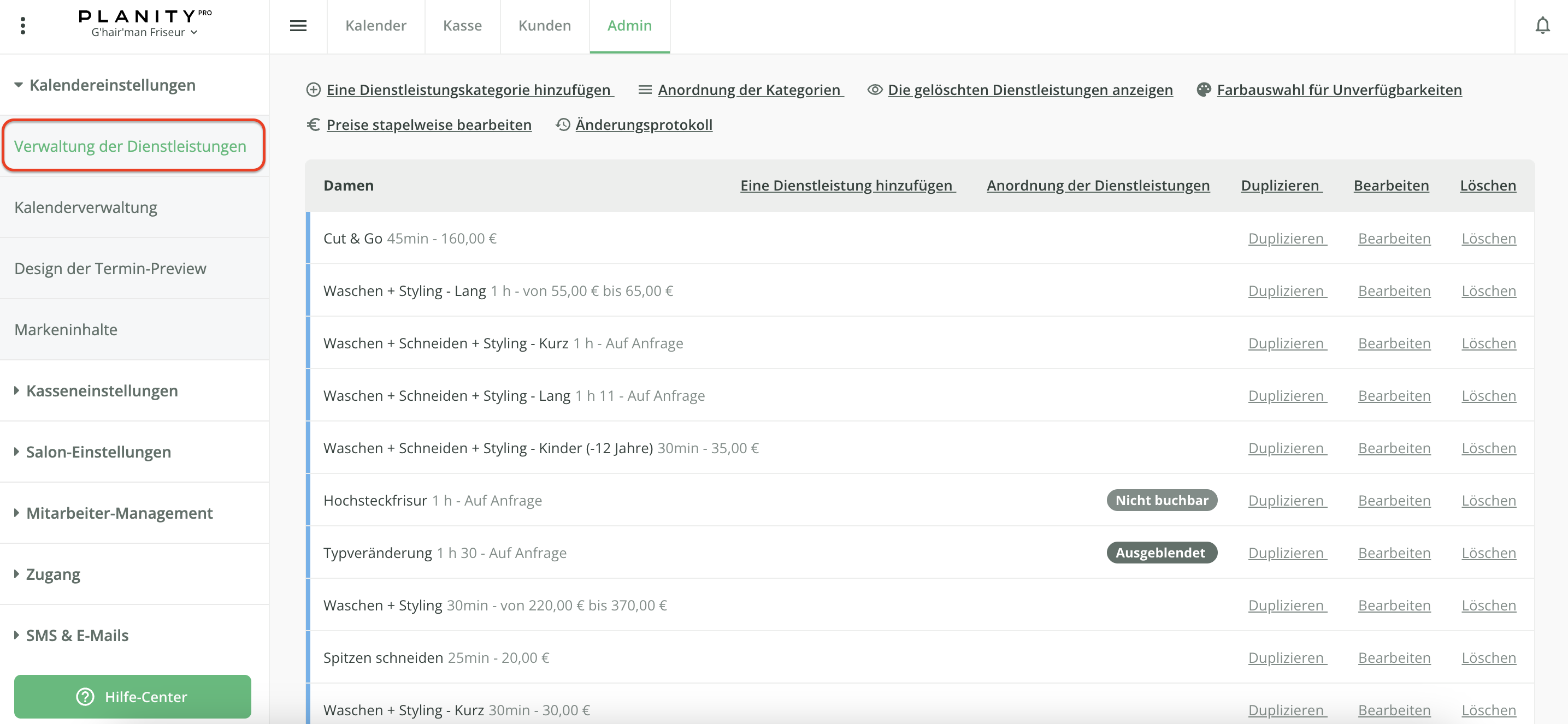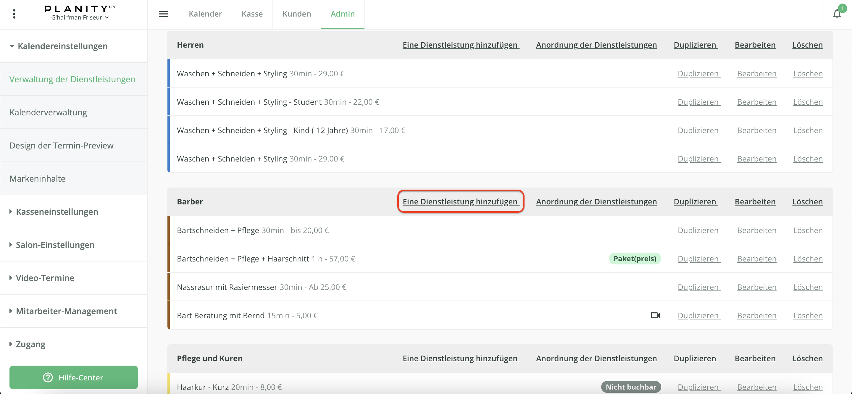 Klicken Sie in der Kategorie Ihrer Wahl auf den Button Eine Dienstleistung hinzufügen.