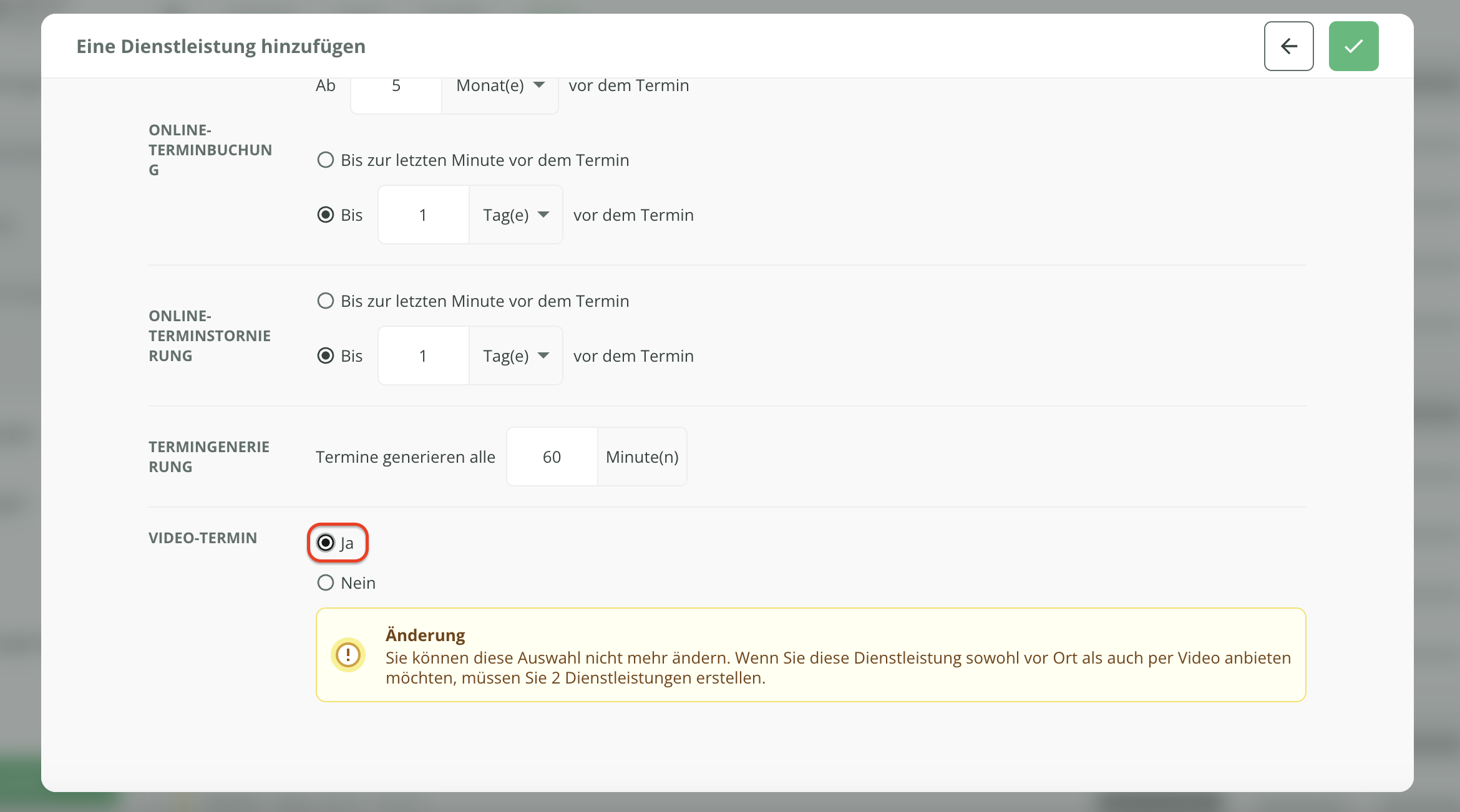 Scrollen Sie nach unten bis in die Rubrik "Video-Termin" und kreuzen sie Ja an.