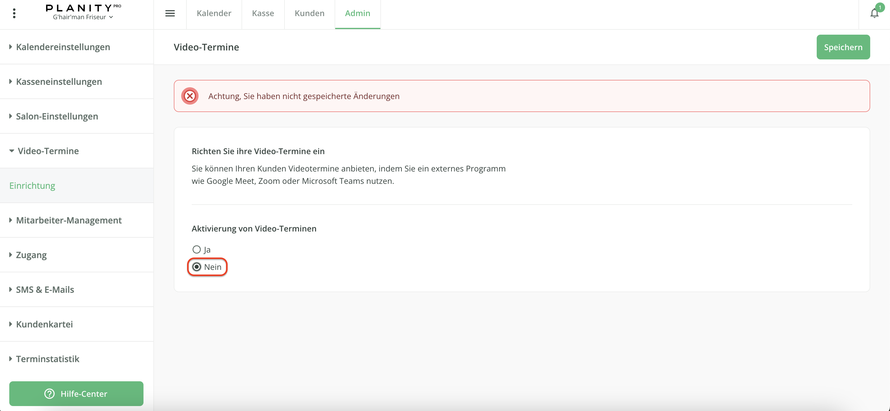 Wählen Sie in der Rubrik Aktivierung von Video-Terminen "Nein"