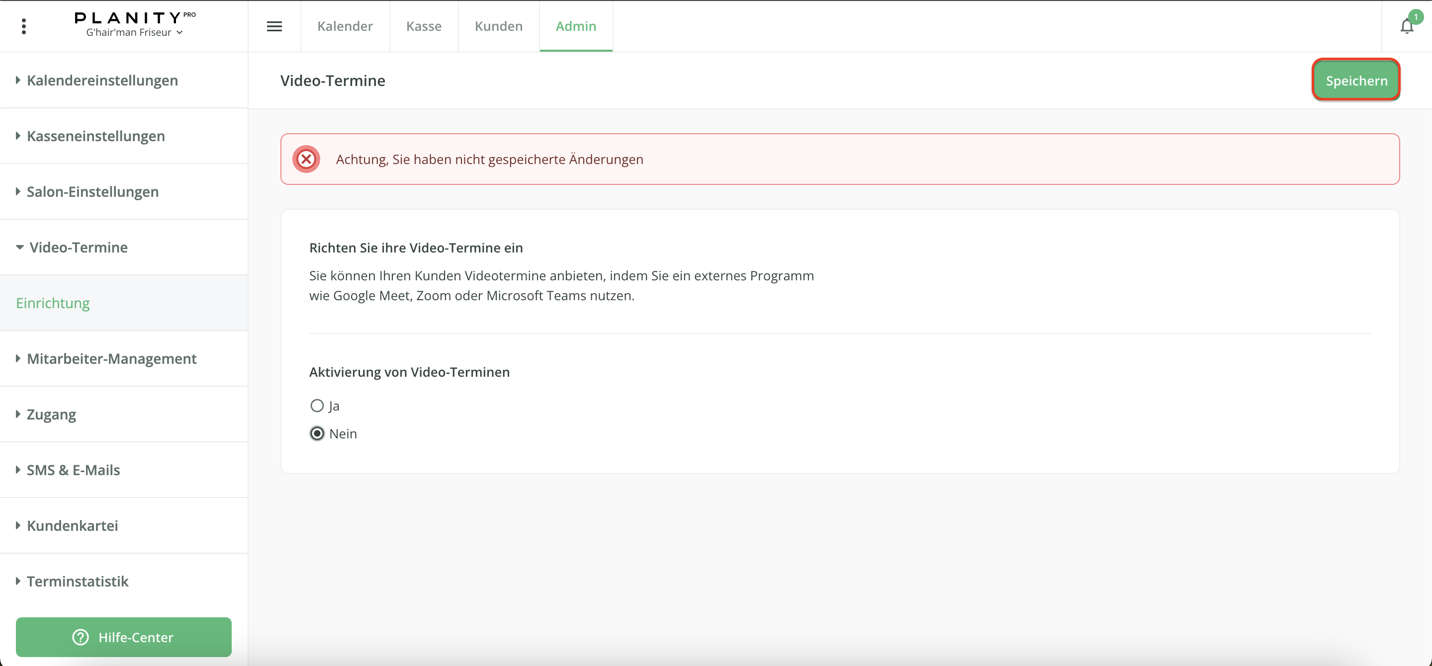 - Wählen Sie in der Rubrik Aktivierung von Video-Terminen "Ja"