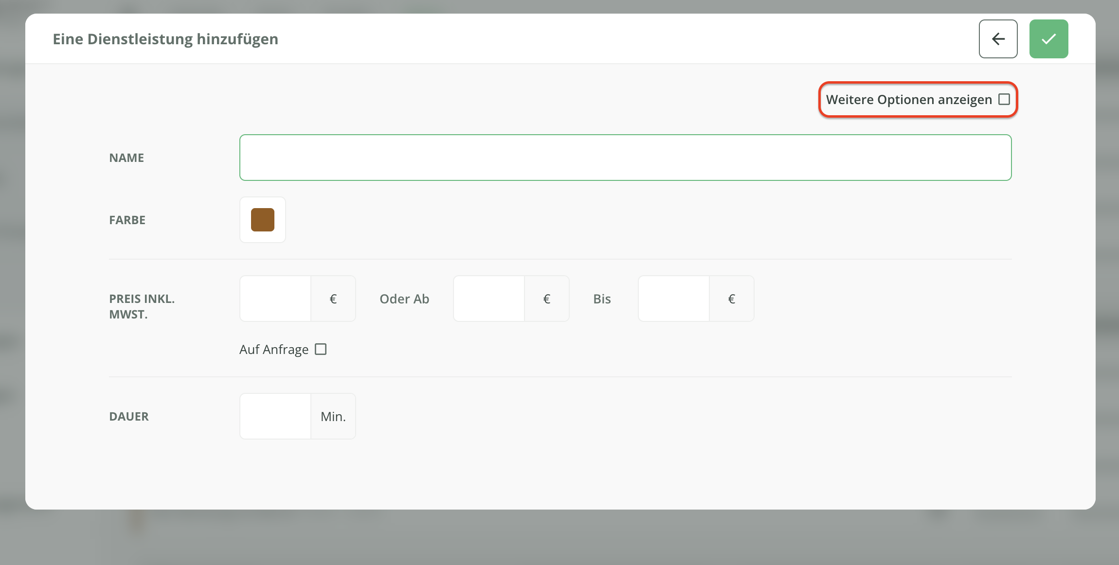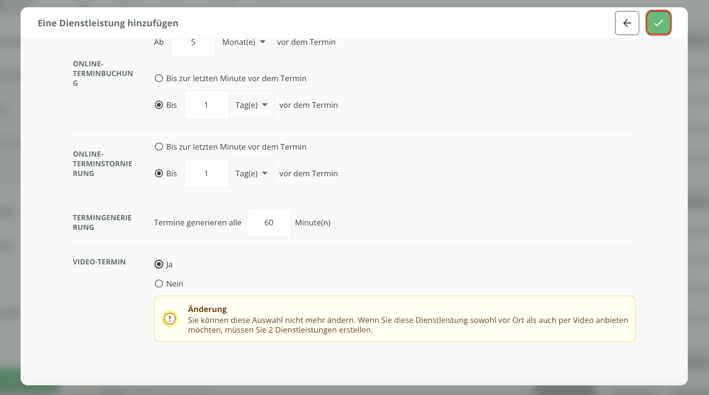 Bestätigen Sie die Erstellung der neuen Dienstleistung über das grüne Häkchen oben rechts im Fenster.