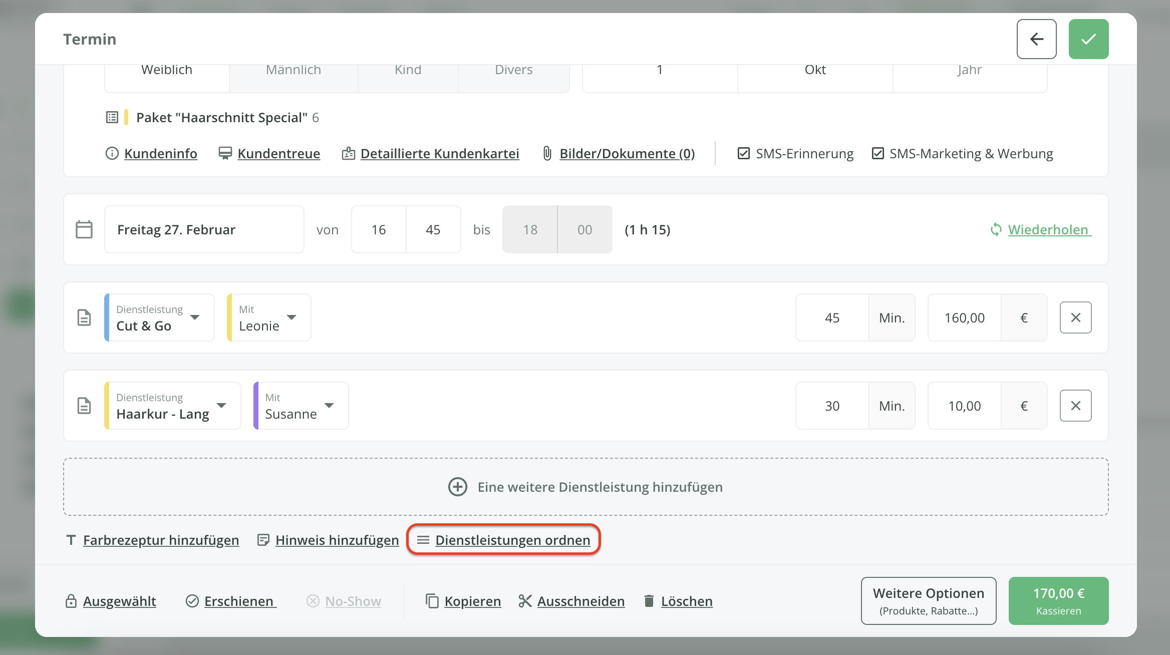 - Klicken Sie innerhalb des Termins auf Dienstleistungen ordnen.