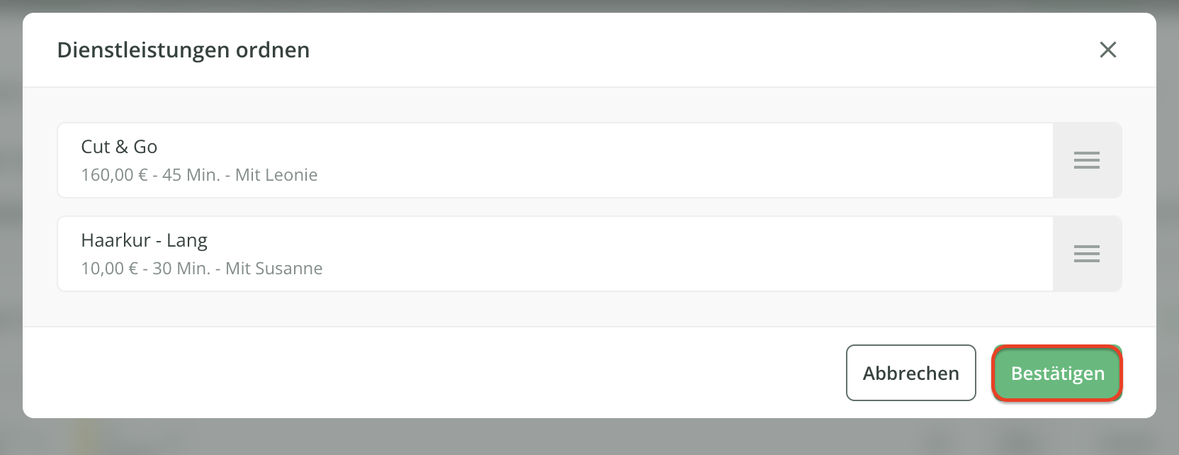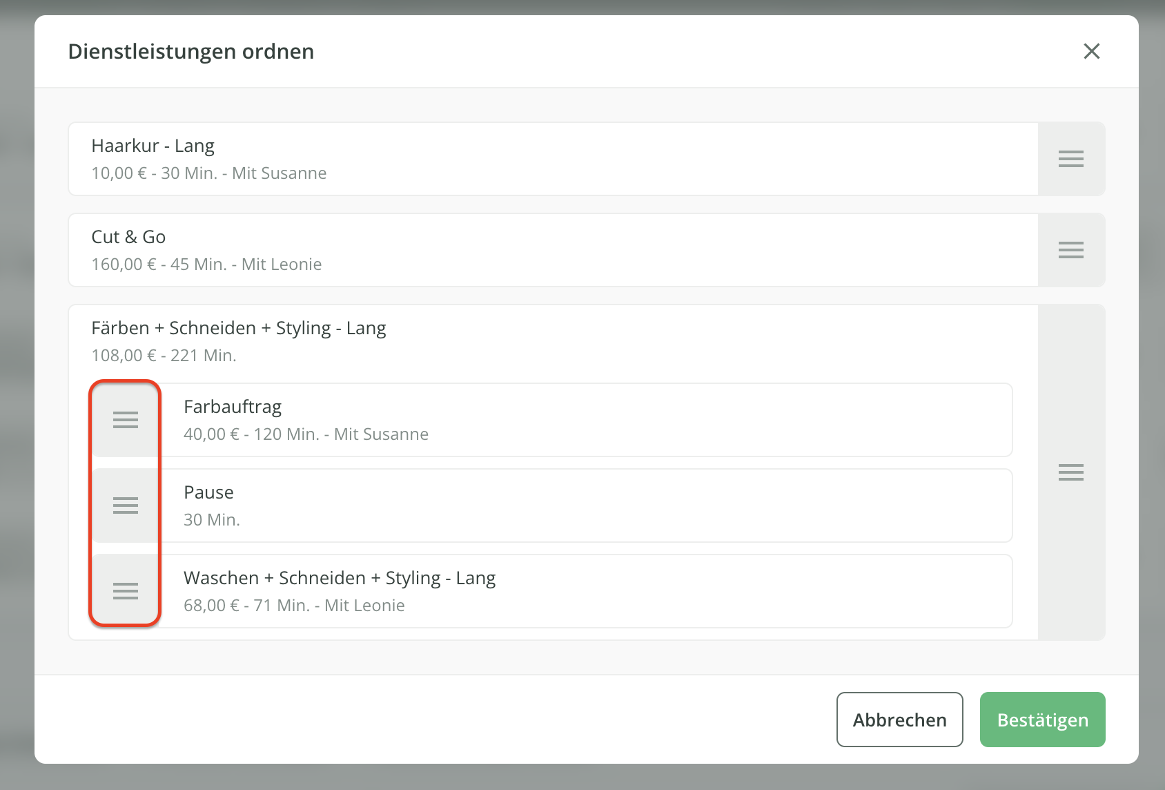 Sie können Dienstelistungen direkt innerhalb eines Termin hin- und herbewegen, wenn Sie die Reihenfolge bzw. den Ablauf eines Termins ändern möchten. Gehen Sie wie folgt vor: