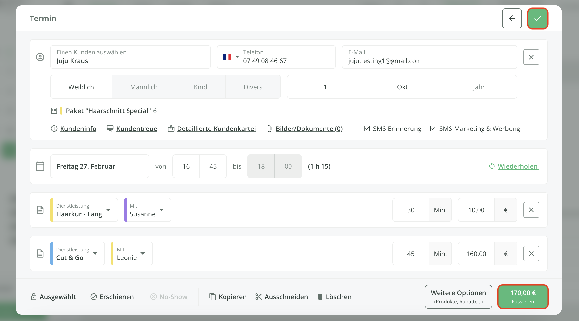 - Anschließend können Sie den Termin wie gewohnt in Ihrem Kalender abspeichern oder direkt kassieren.