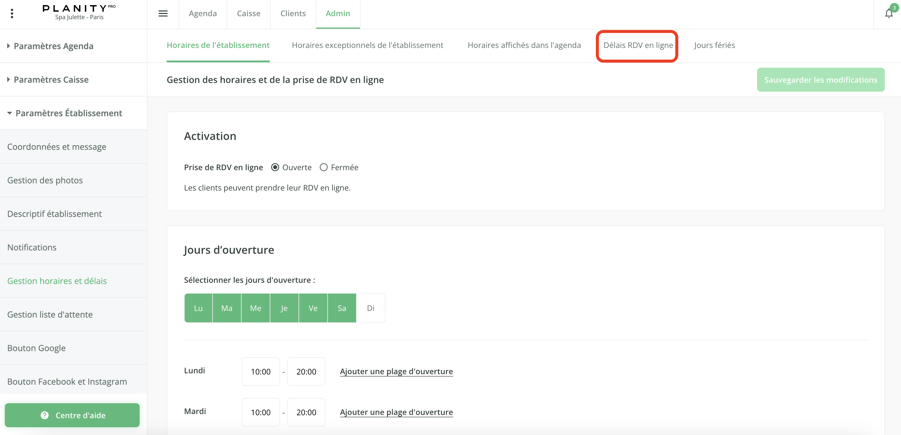 - La partie pour personnaliser les délais par prestations (cliquez ici : Comment personnaliser les délais de prise de RDV pour chaque prestation ?)