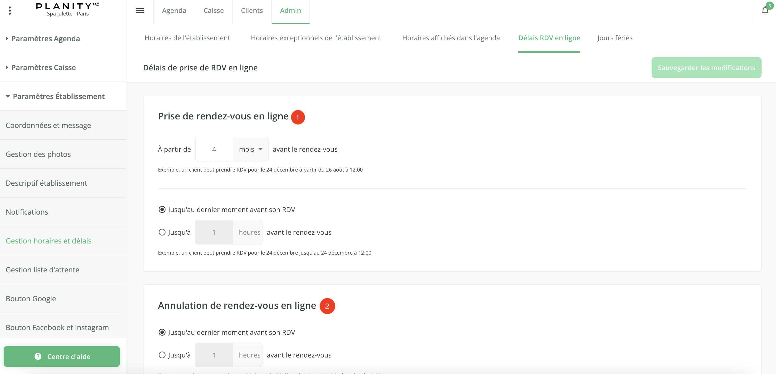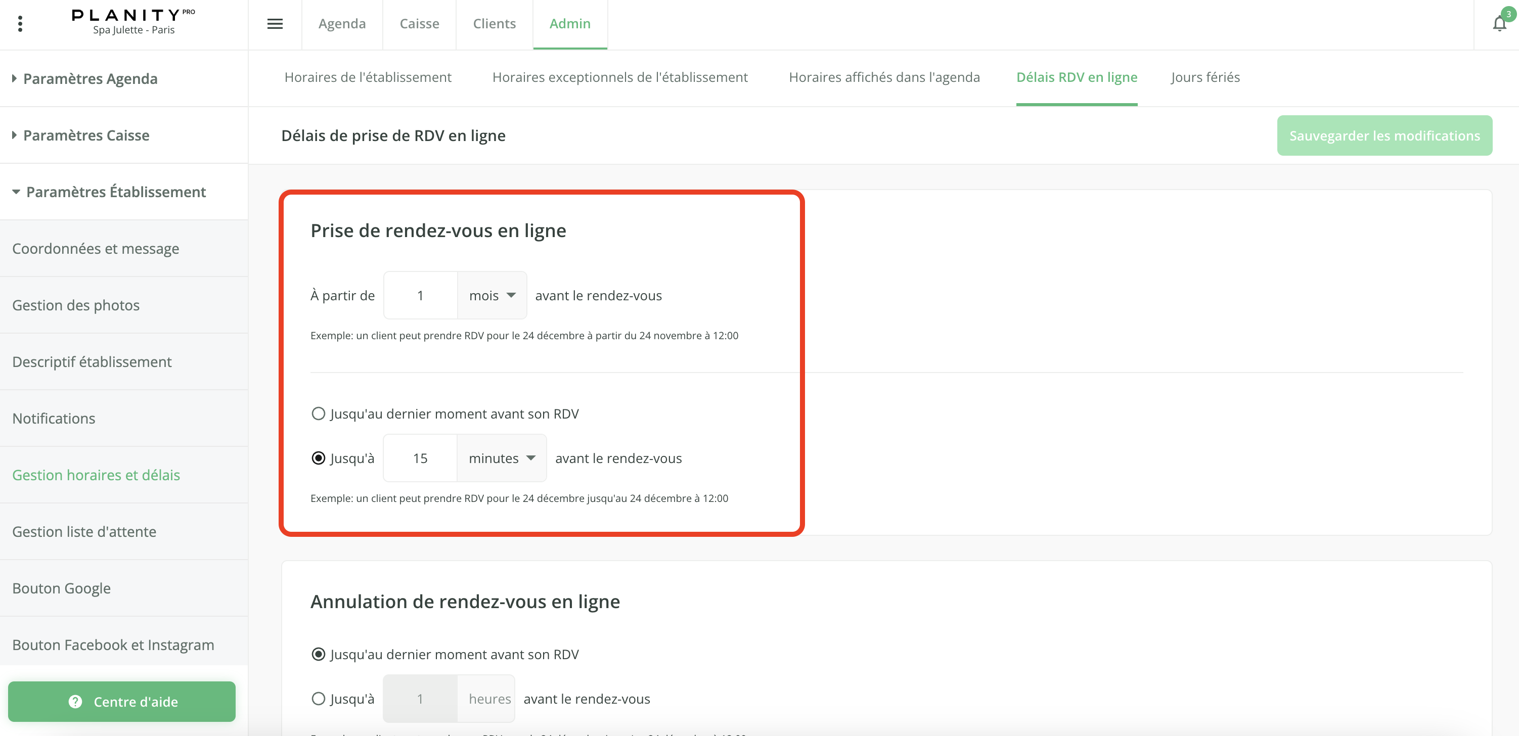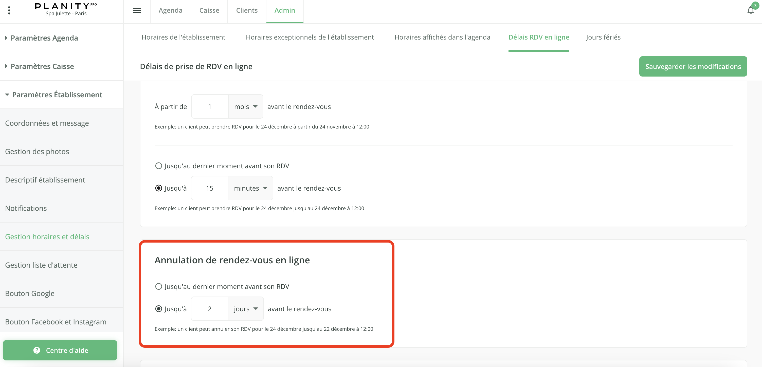- La partie pour gérer les délais d'annulation de RDV en ligne