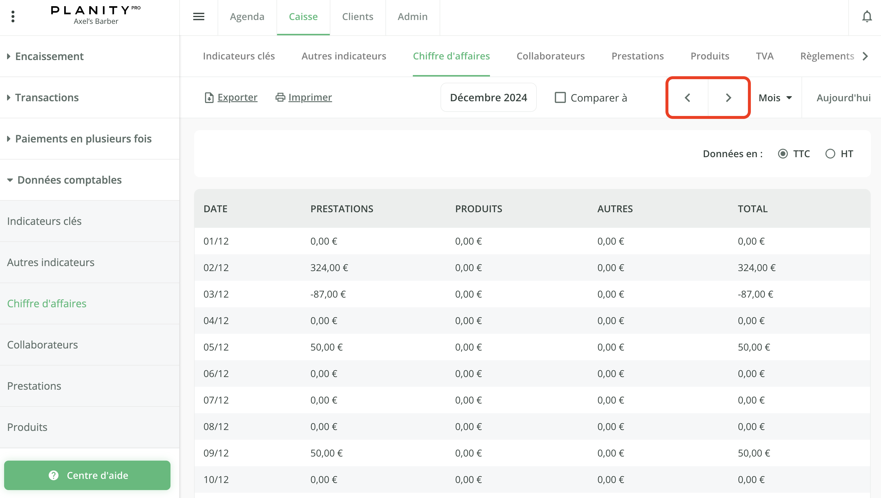 - Vous pouvez ensuite passer à la période précédente ou suivante, avec les flèches de navigation, encadrées en rouge.