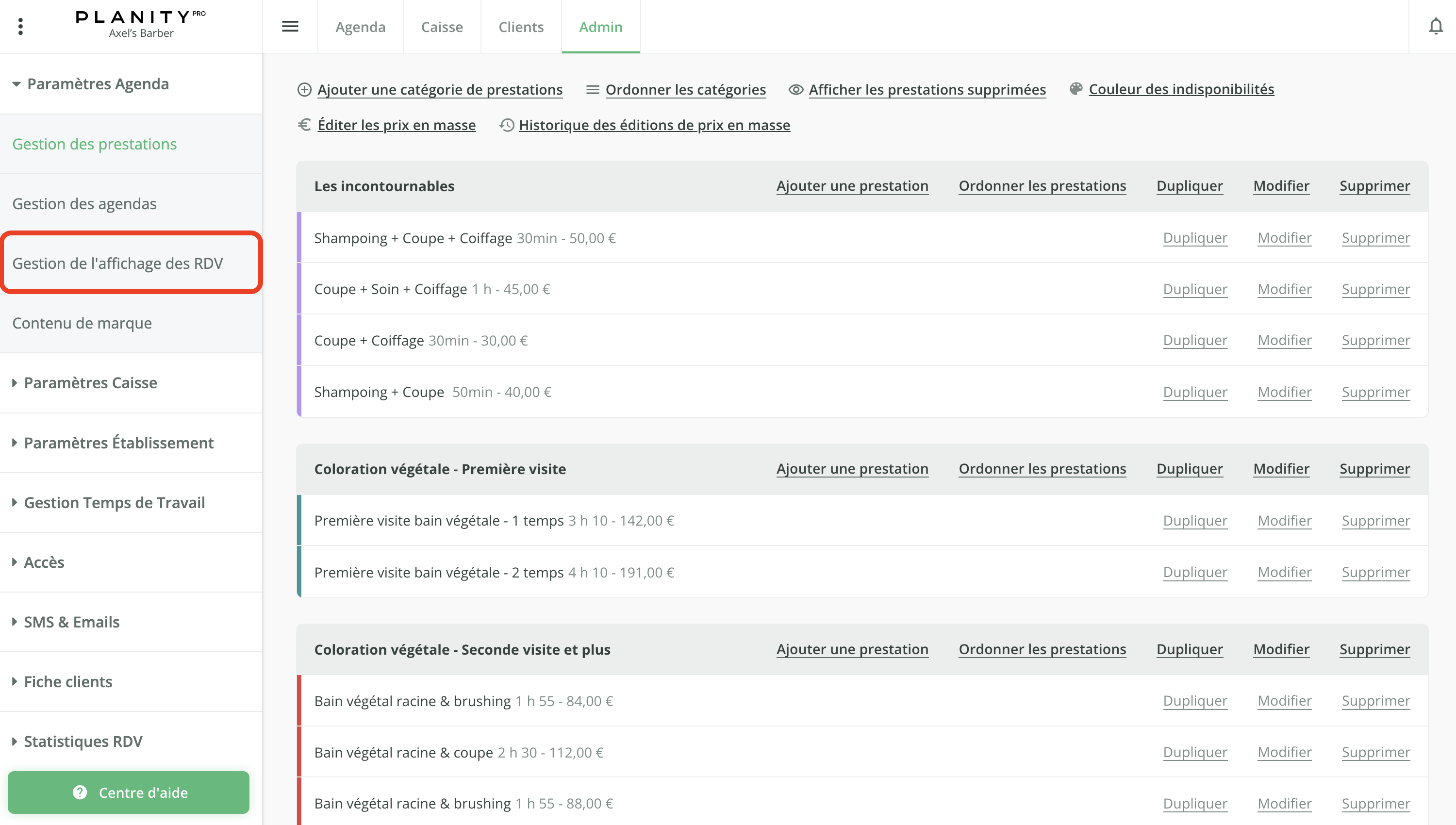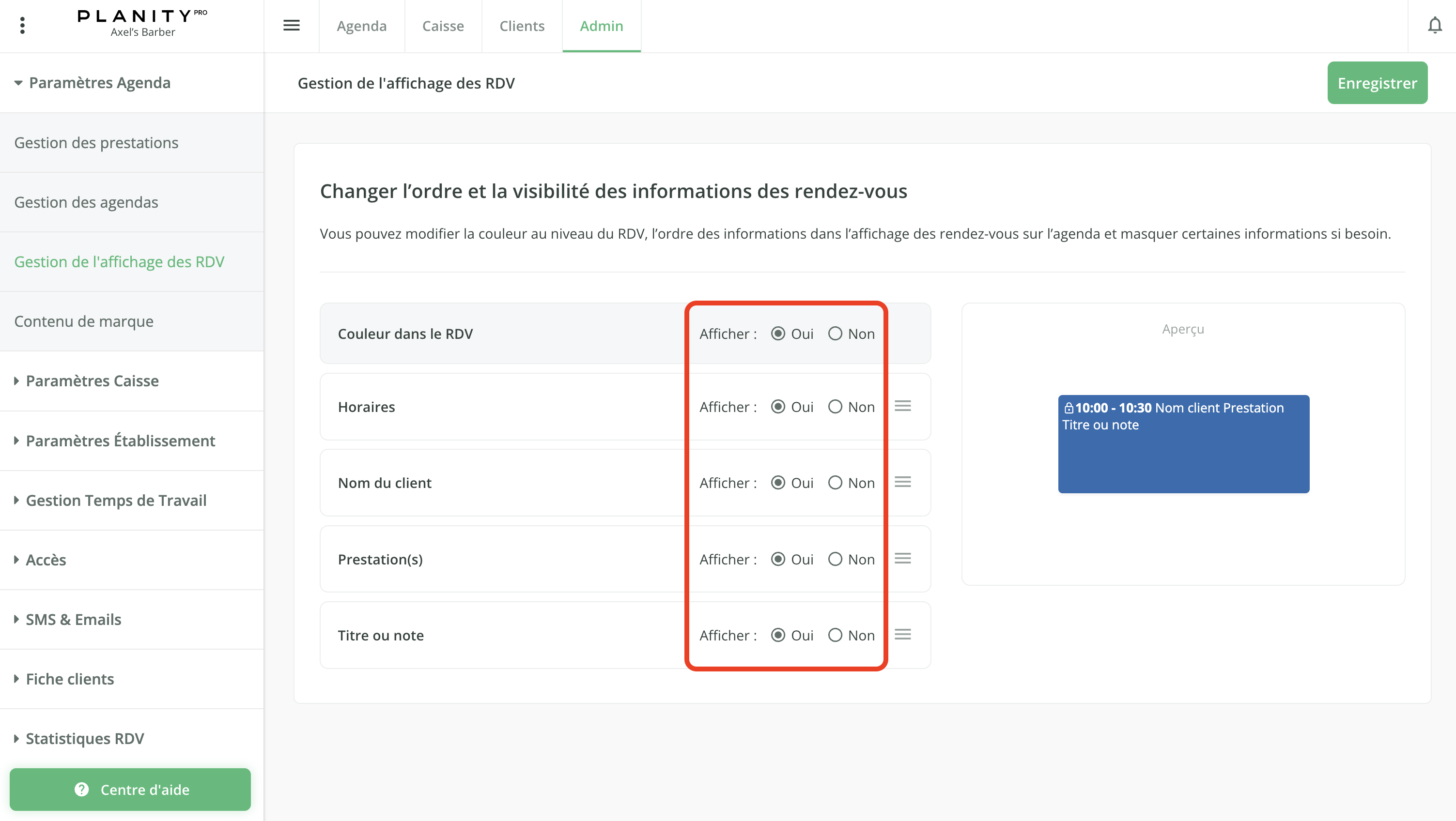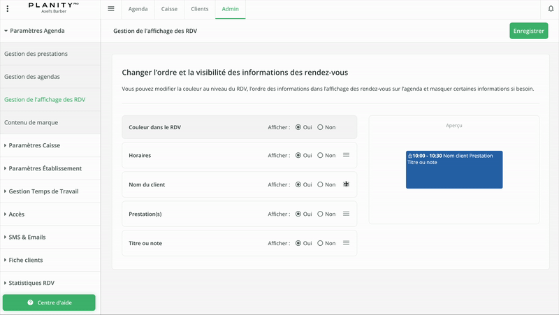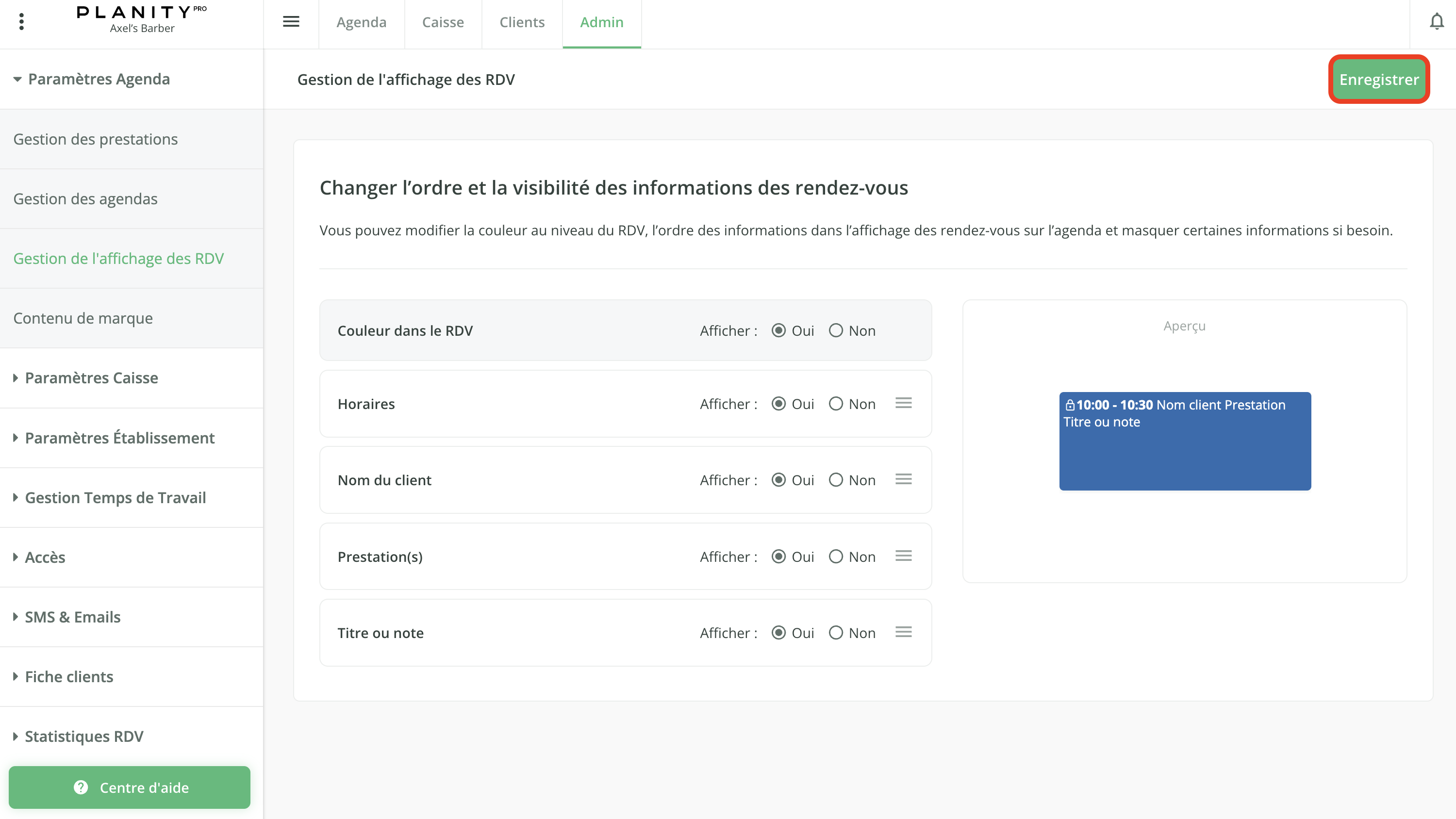 - Une fois satisfait, n'oubliez pas de cliquer sur Enregistrer en haut à droite de votre écran. Les modifications seront alors active sur votre Agenda.