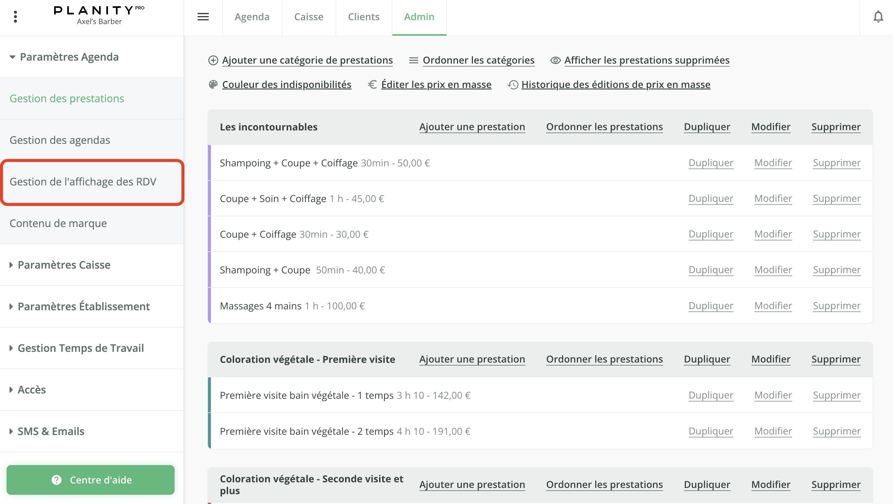 - Cliquez sur le sous menu Gestion de l'affichage des RDV.