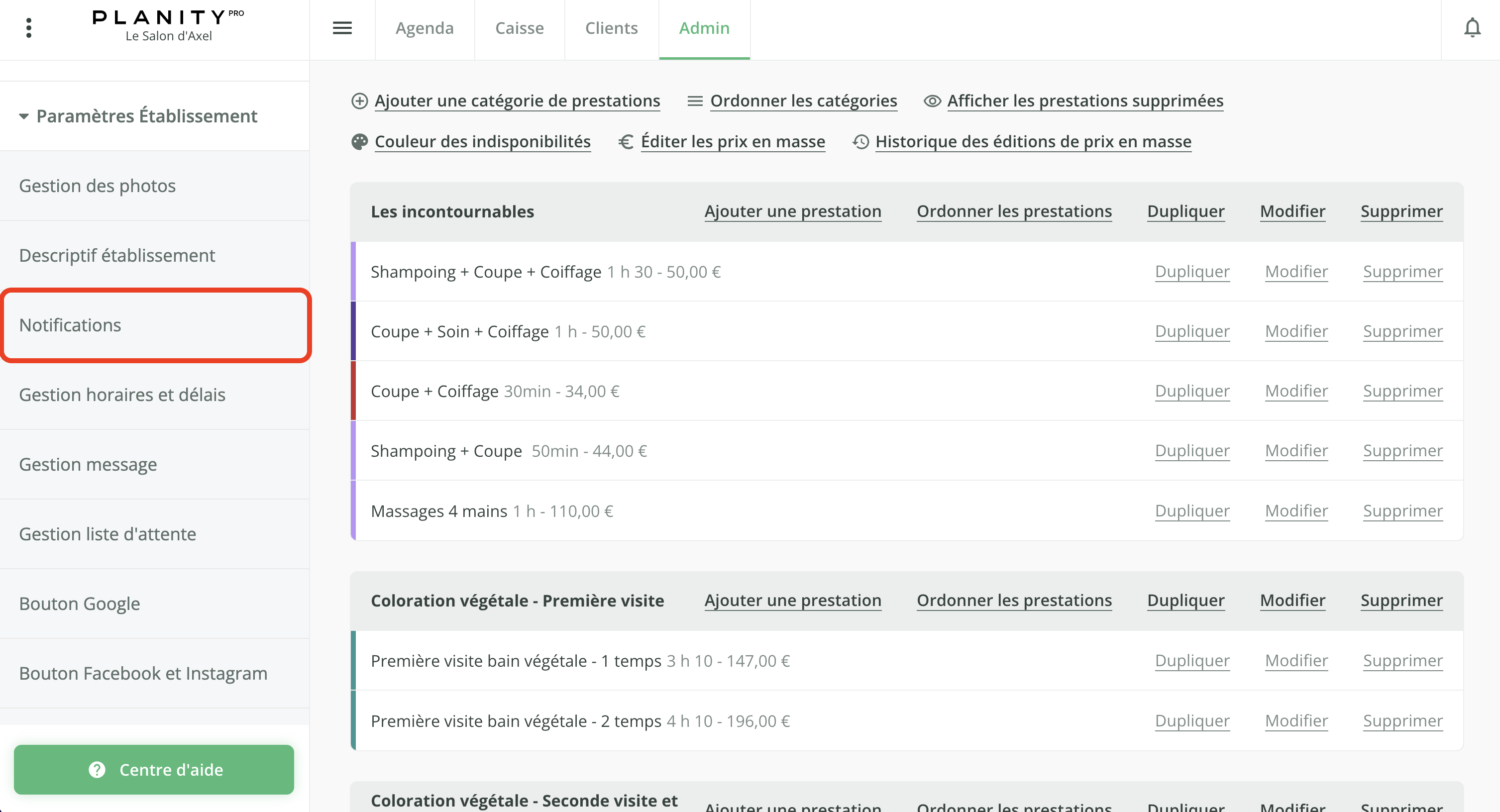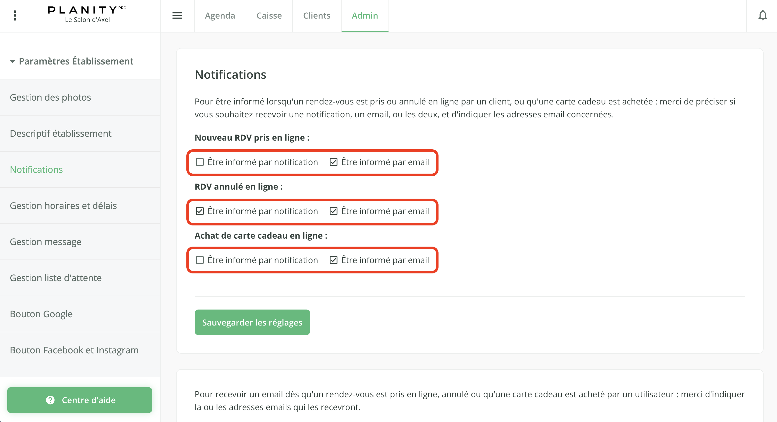 - Pour chaque type de notification (nouveau rendez-vous pris en ligne, rendez-vous annulé, achat de carte cadeau), choisissez comment vous souhaitez la recevoir :