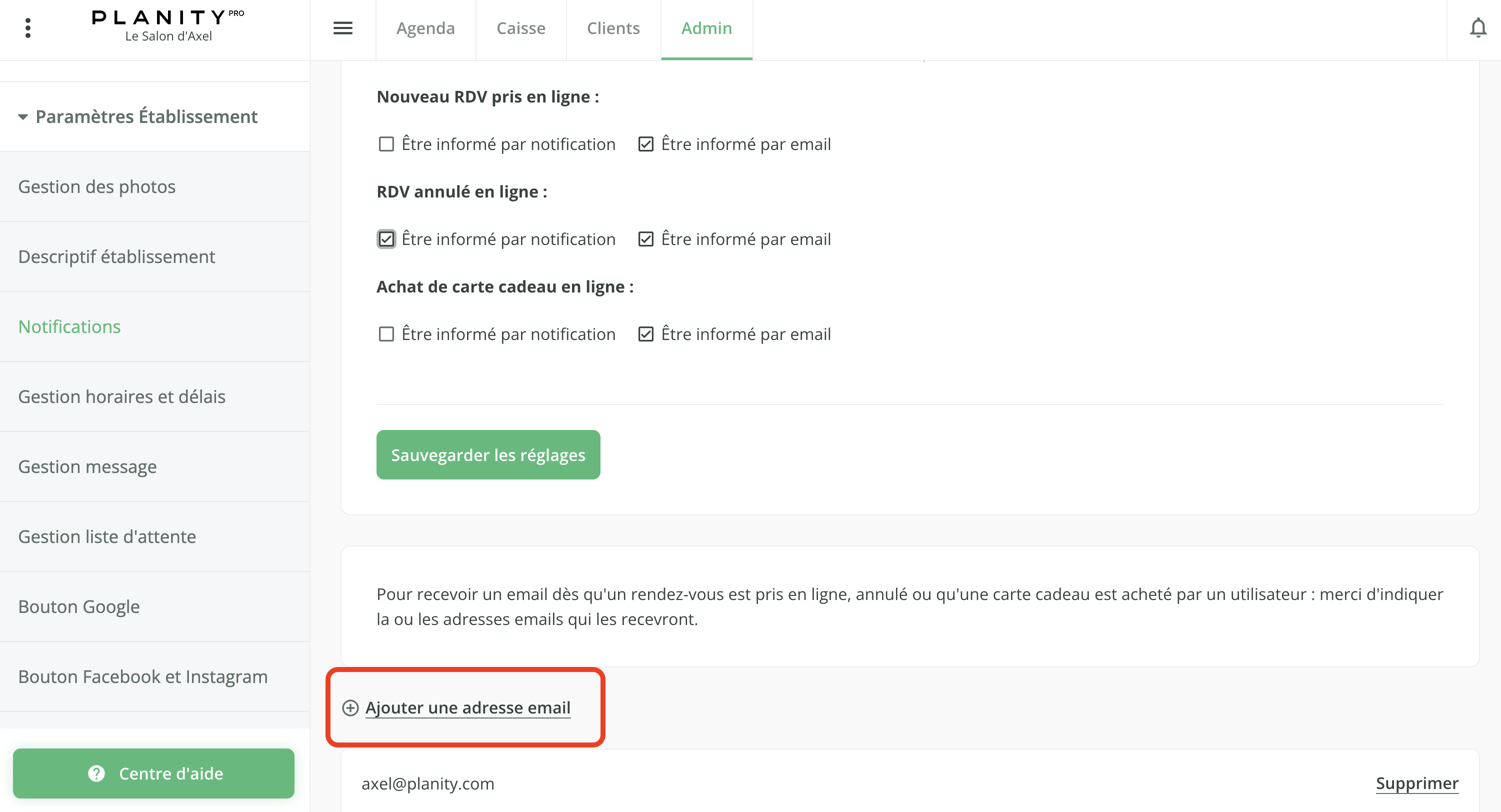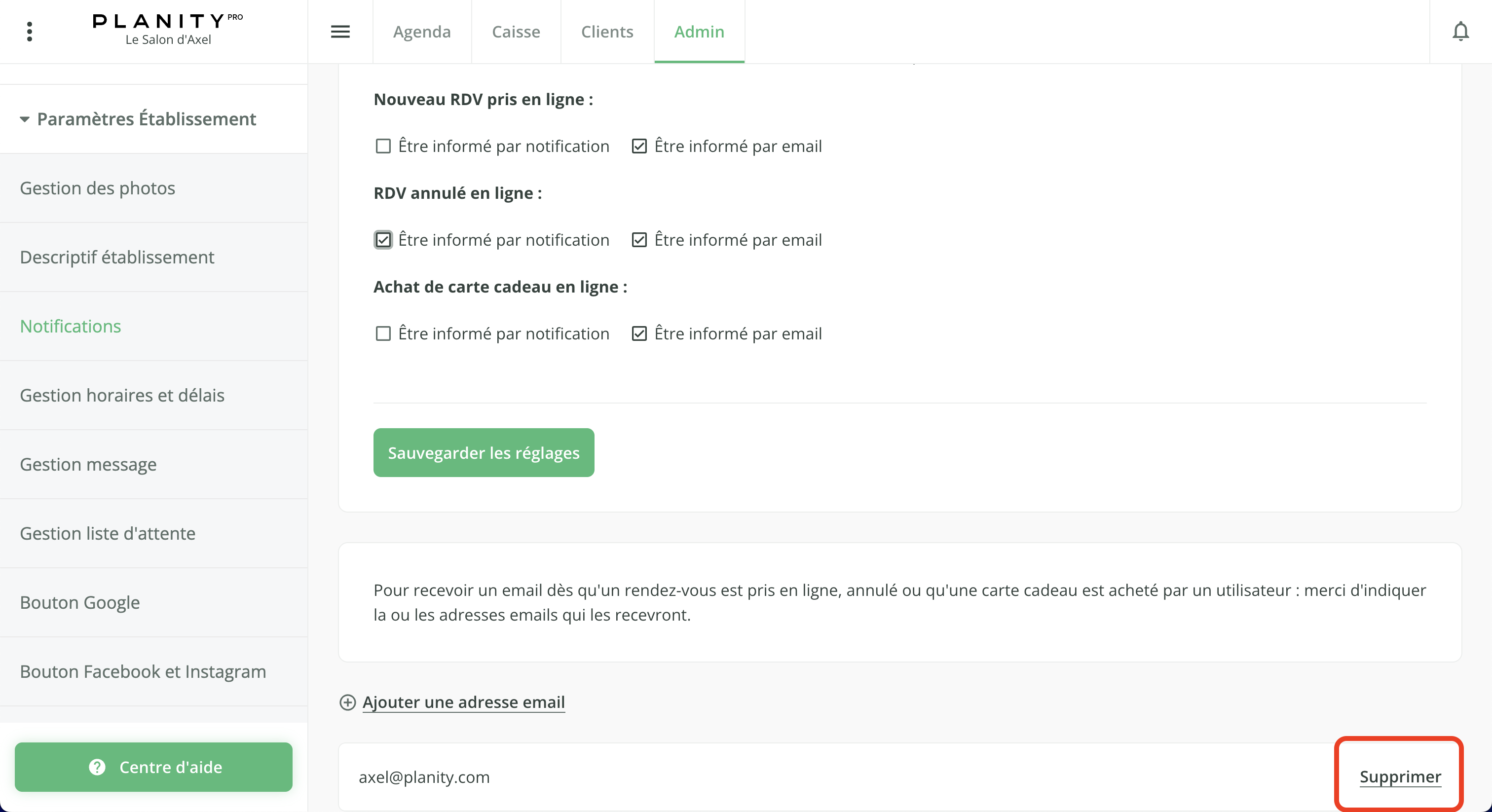 - Vous pouvez ensuite supprimer une adresse si vous ne souhaitez plus recevoir de mails pour les rendez-vous pris ou annulés.