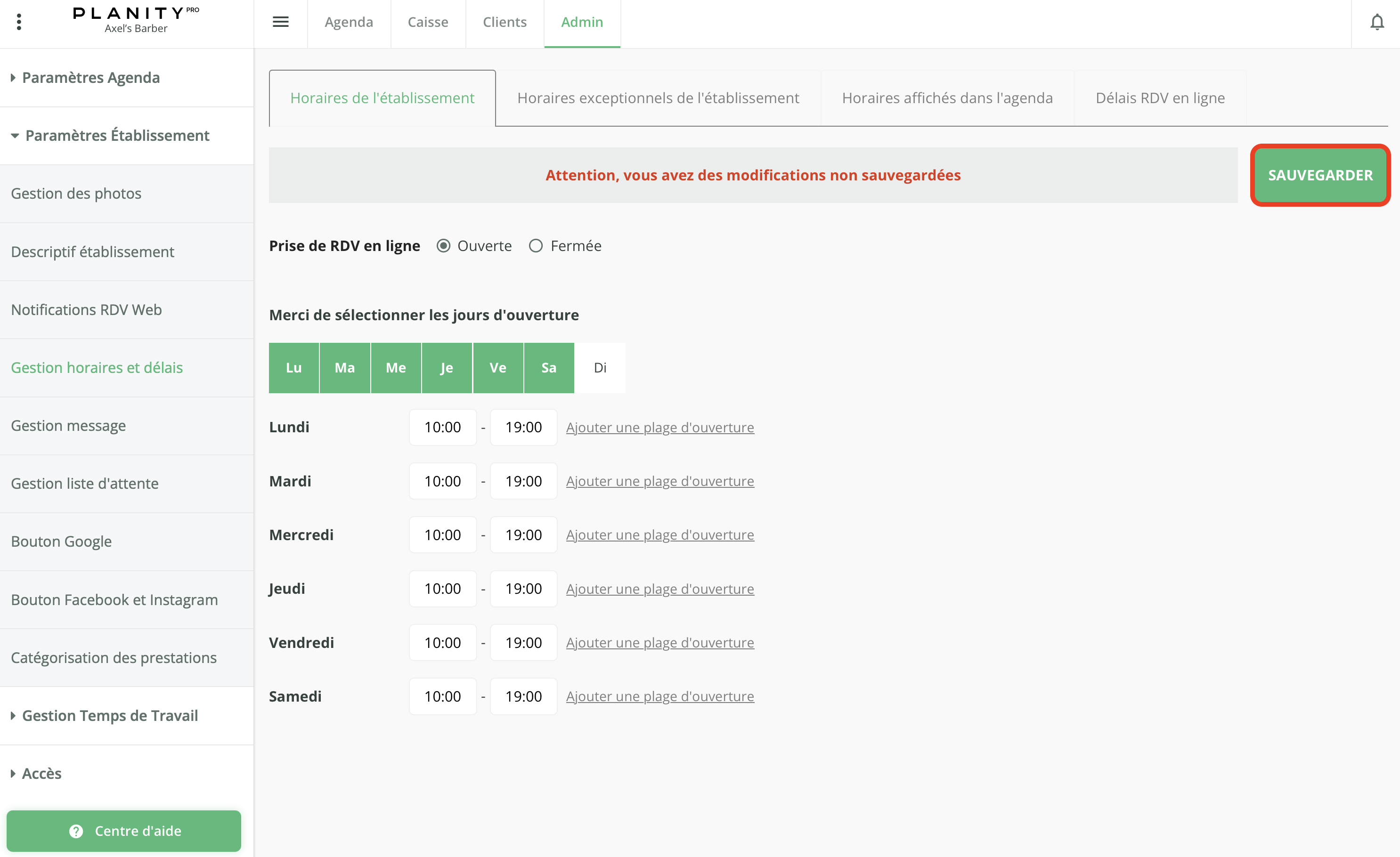 - Dans l'onglet Horaires de l'établissement, vous sélectionnez vos jours et horaires d'ouverture.