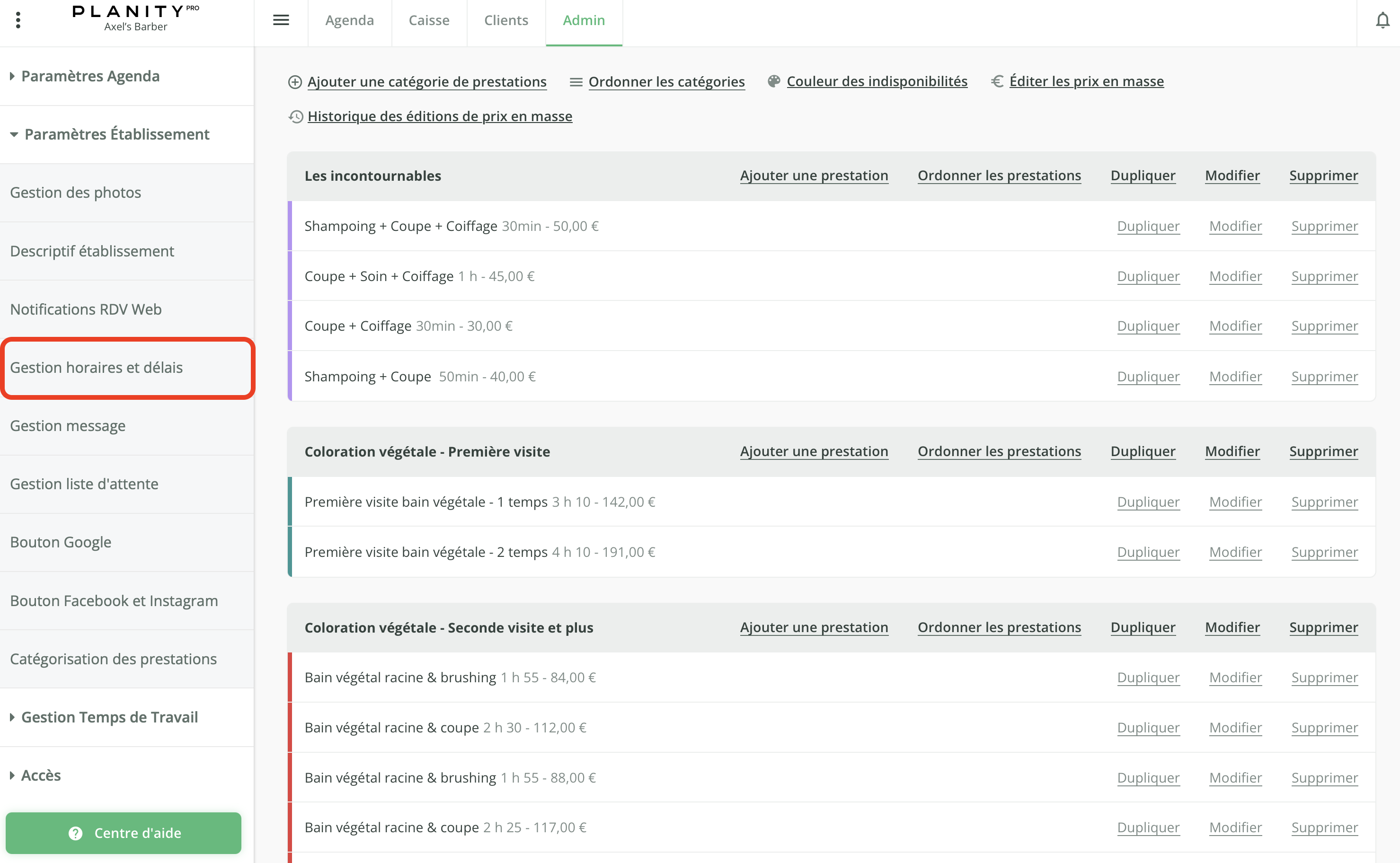 - Cliquez sur le sous menu "Gestion horaires et délais".