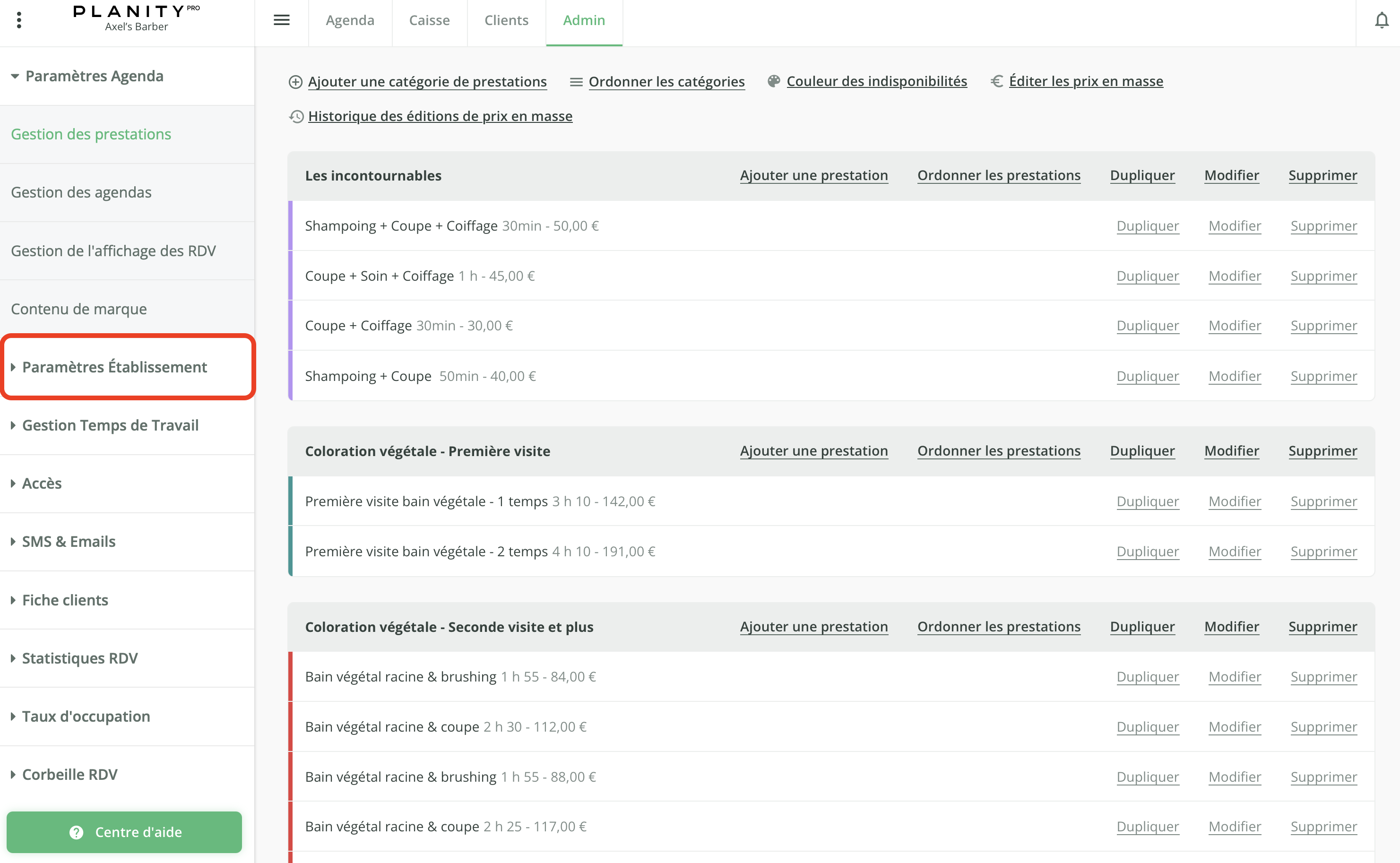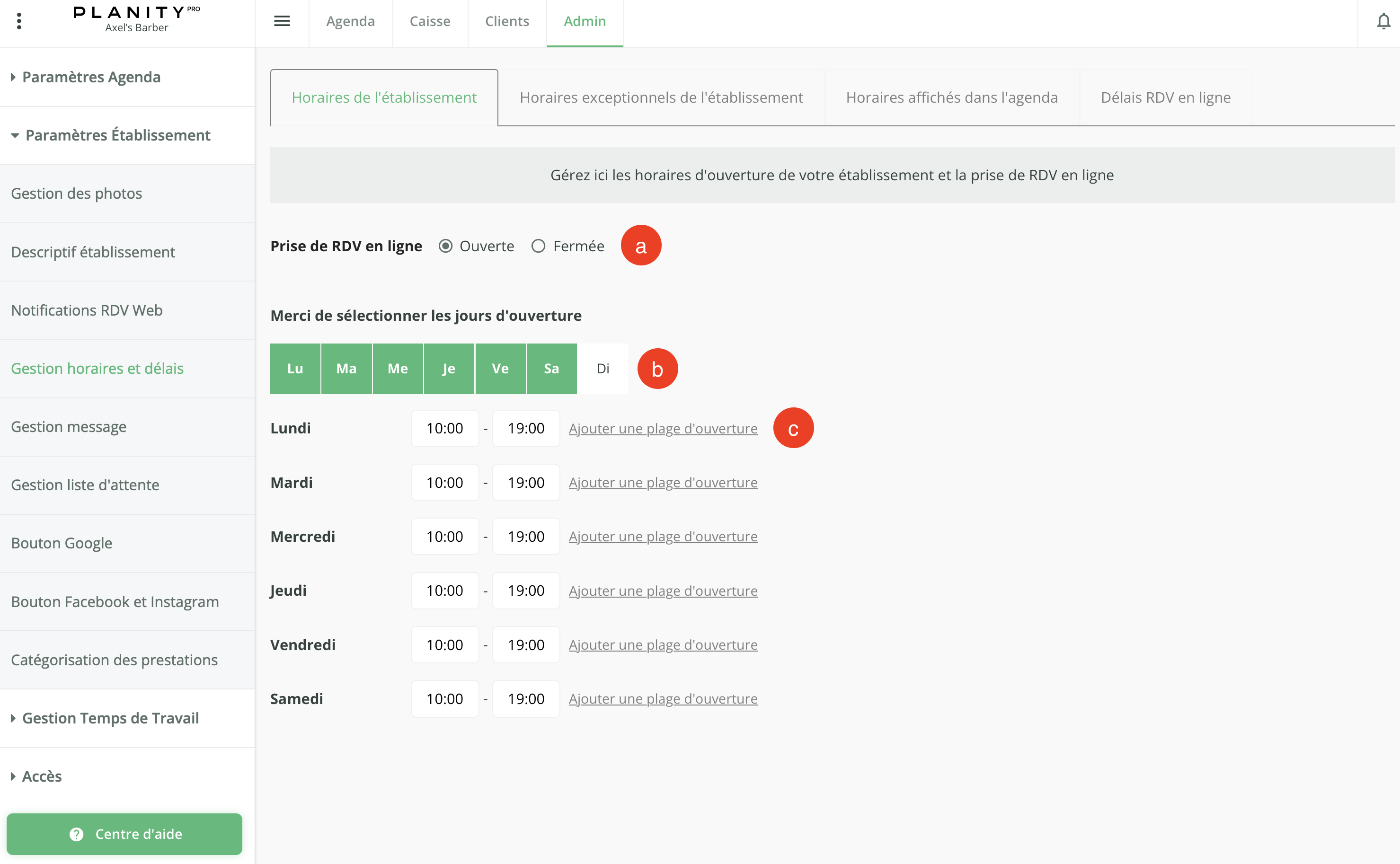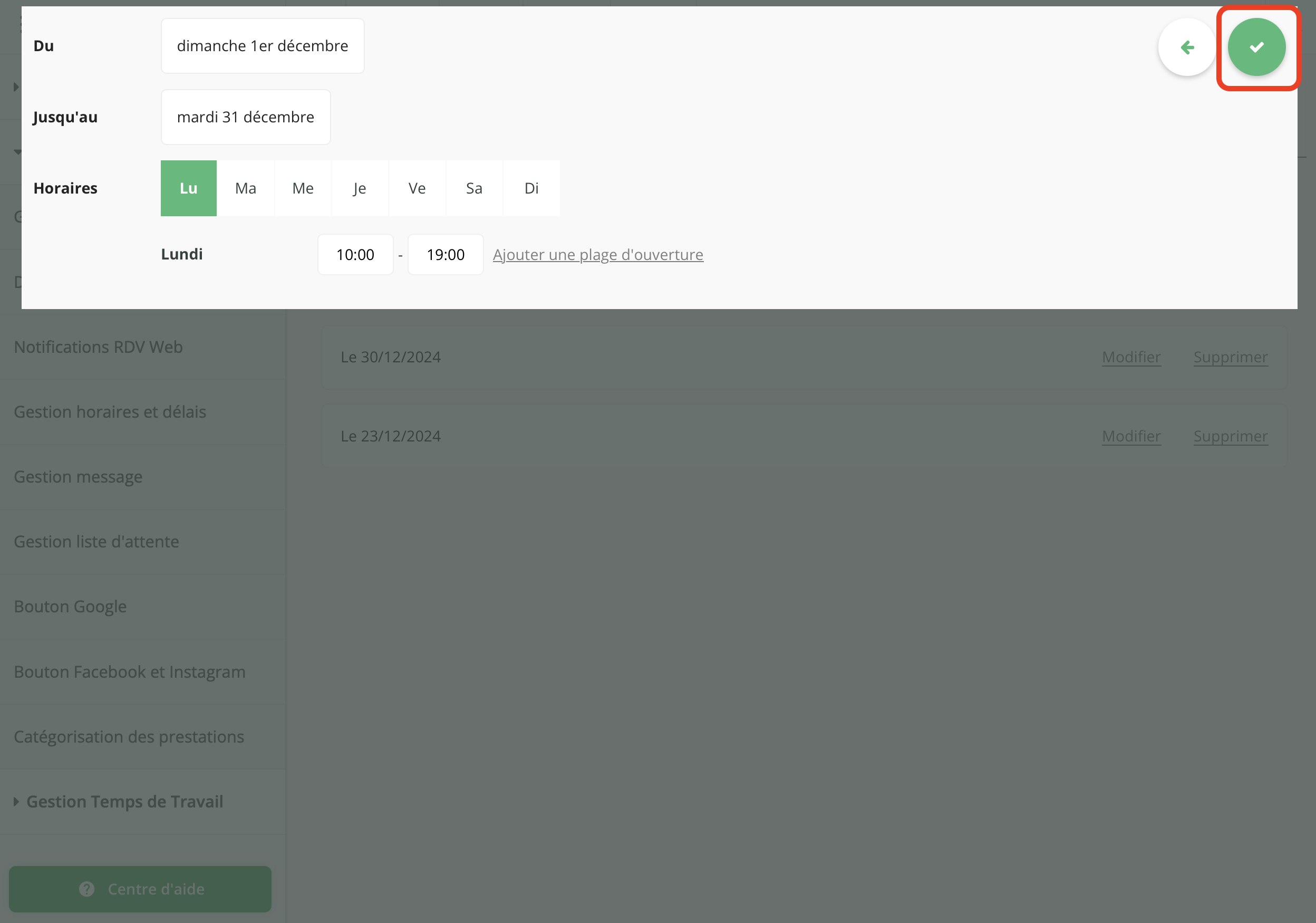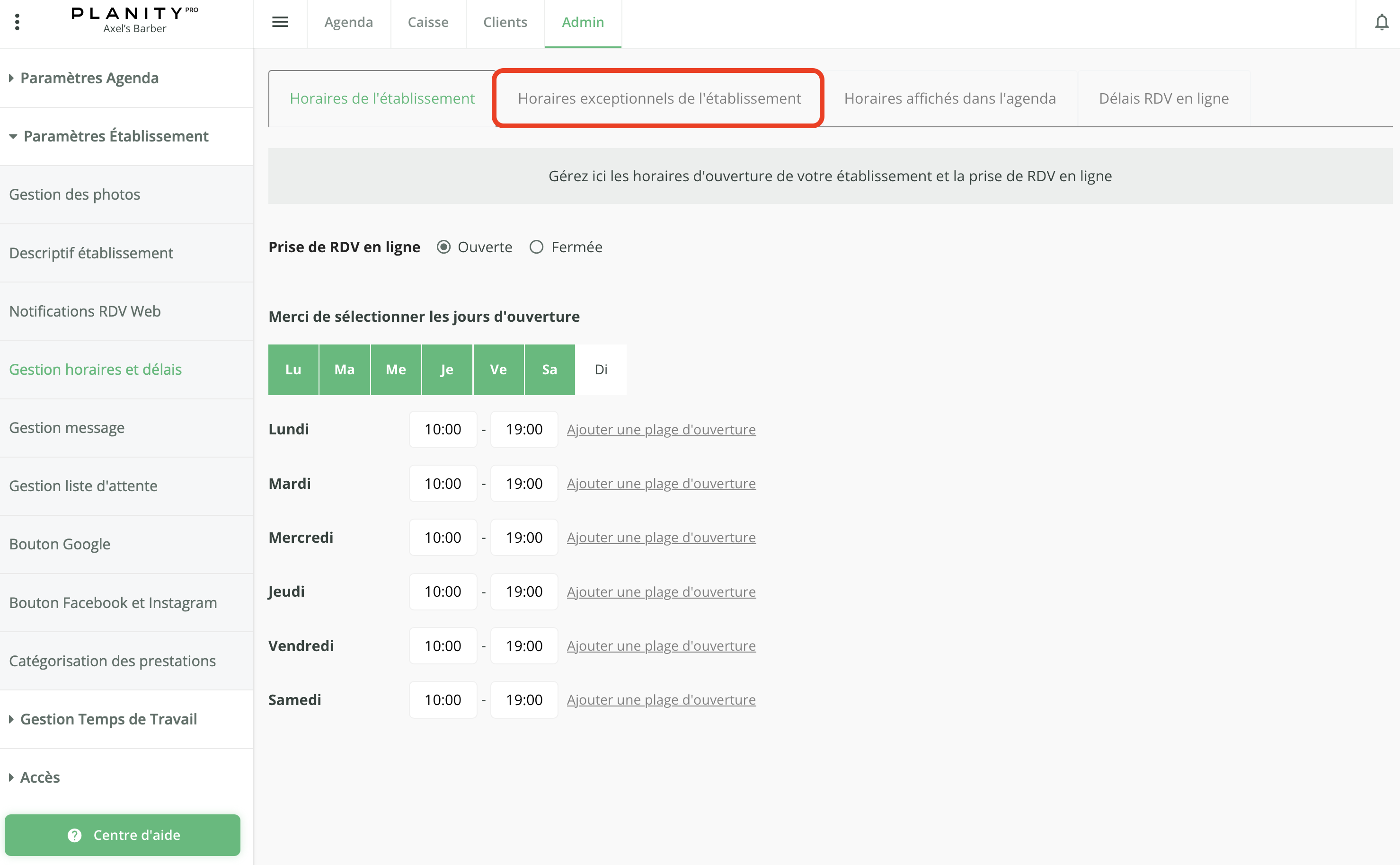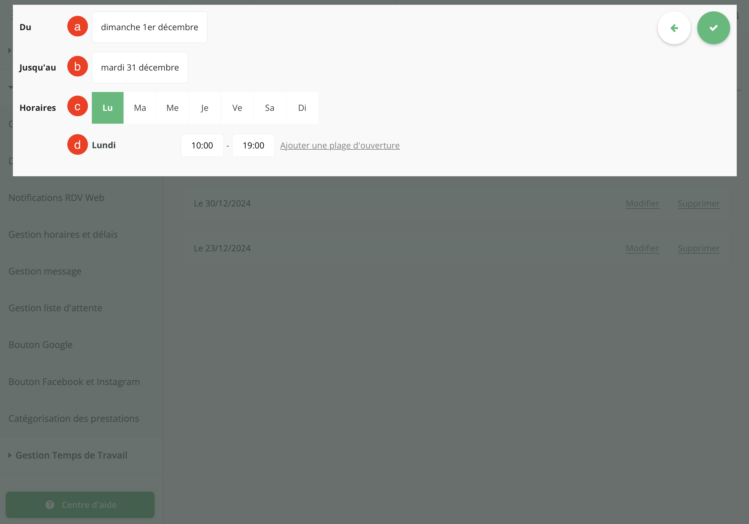 Dans le cas d'une ouverture exceptionnelle de votre salon ou institut, par exemple pour les fêtes de Noël ou un jour férié, il est important que vous mettiez à jour vos horaires Planity. Pour cela :