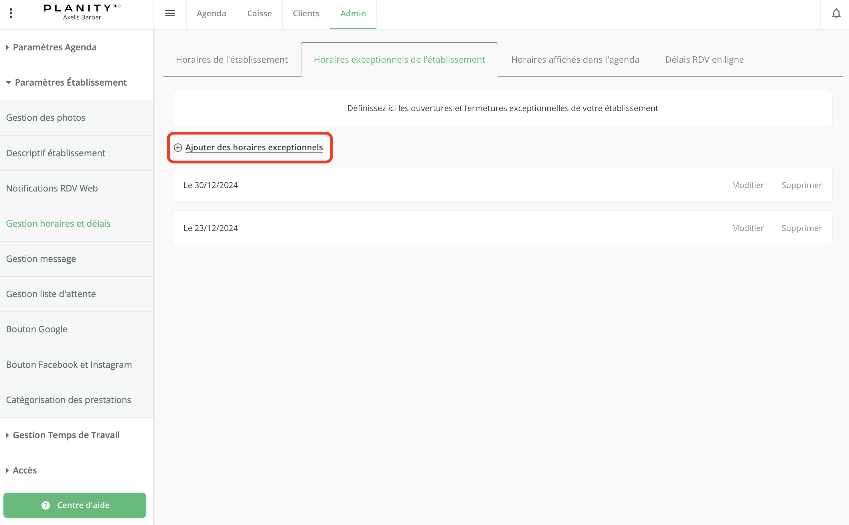 - Cliquez sur "Ajouter des horaires exceptionnels"