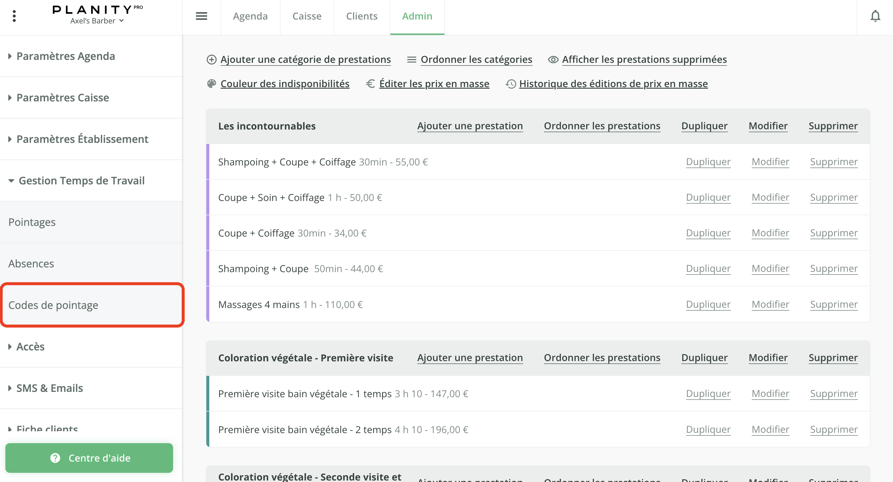 - Cliquez sur le menu Codes de pointage.