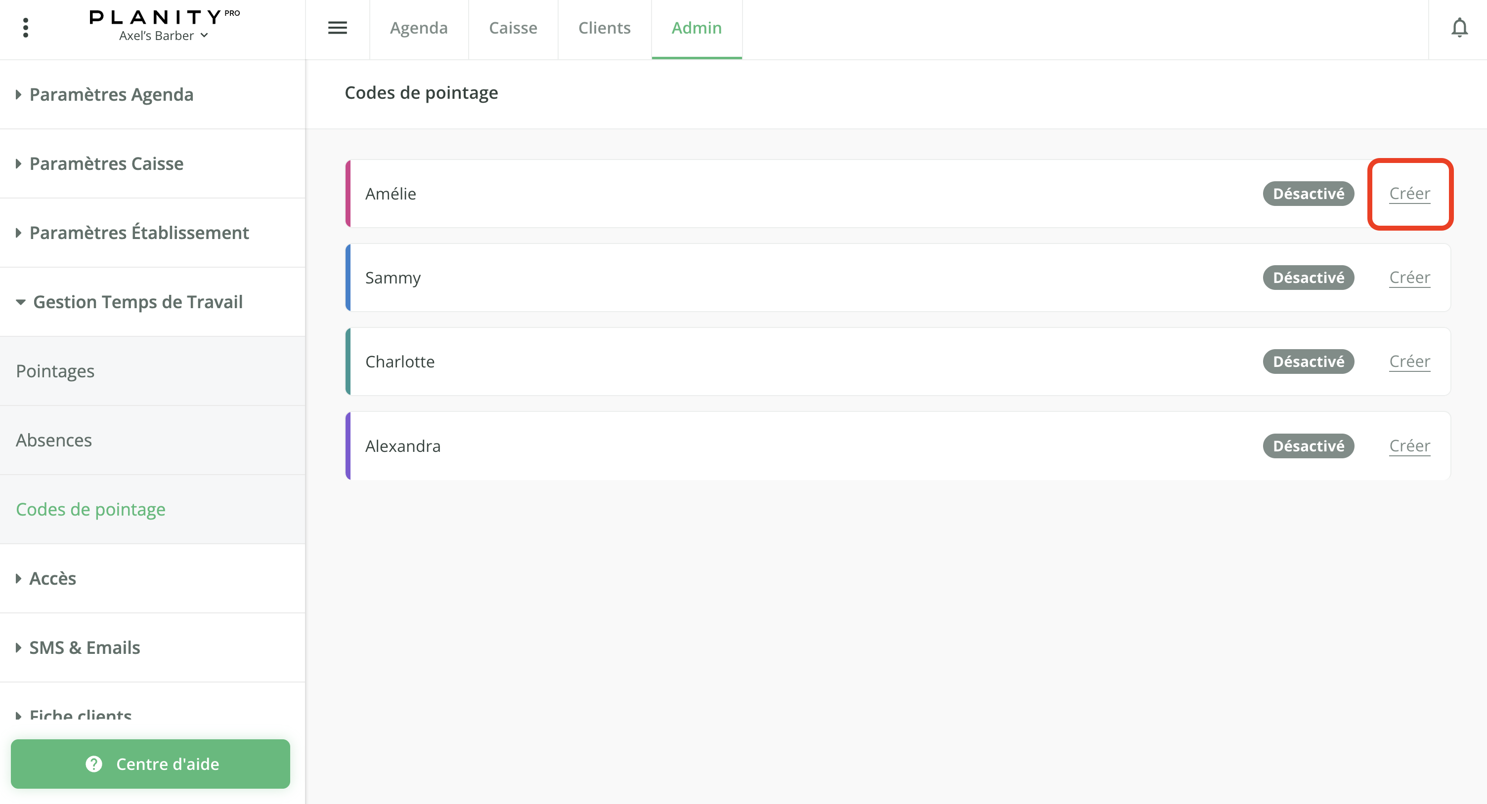- Pour créer des codes de pointage, cliquez sur l'onglet Admin en haut de votre écran.