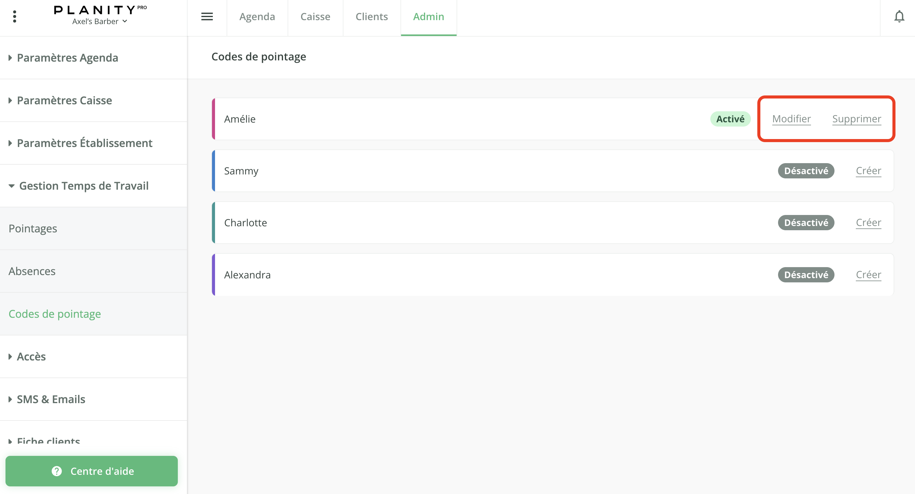 - Une fois créé, vous pourrez toujours modifier ou supprimer le code de pointage à l'aide des boutons Modifier ou Supprimer sur la ligne du collaborateur concerné.