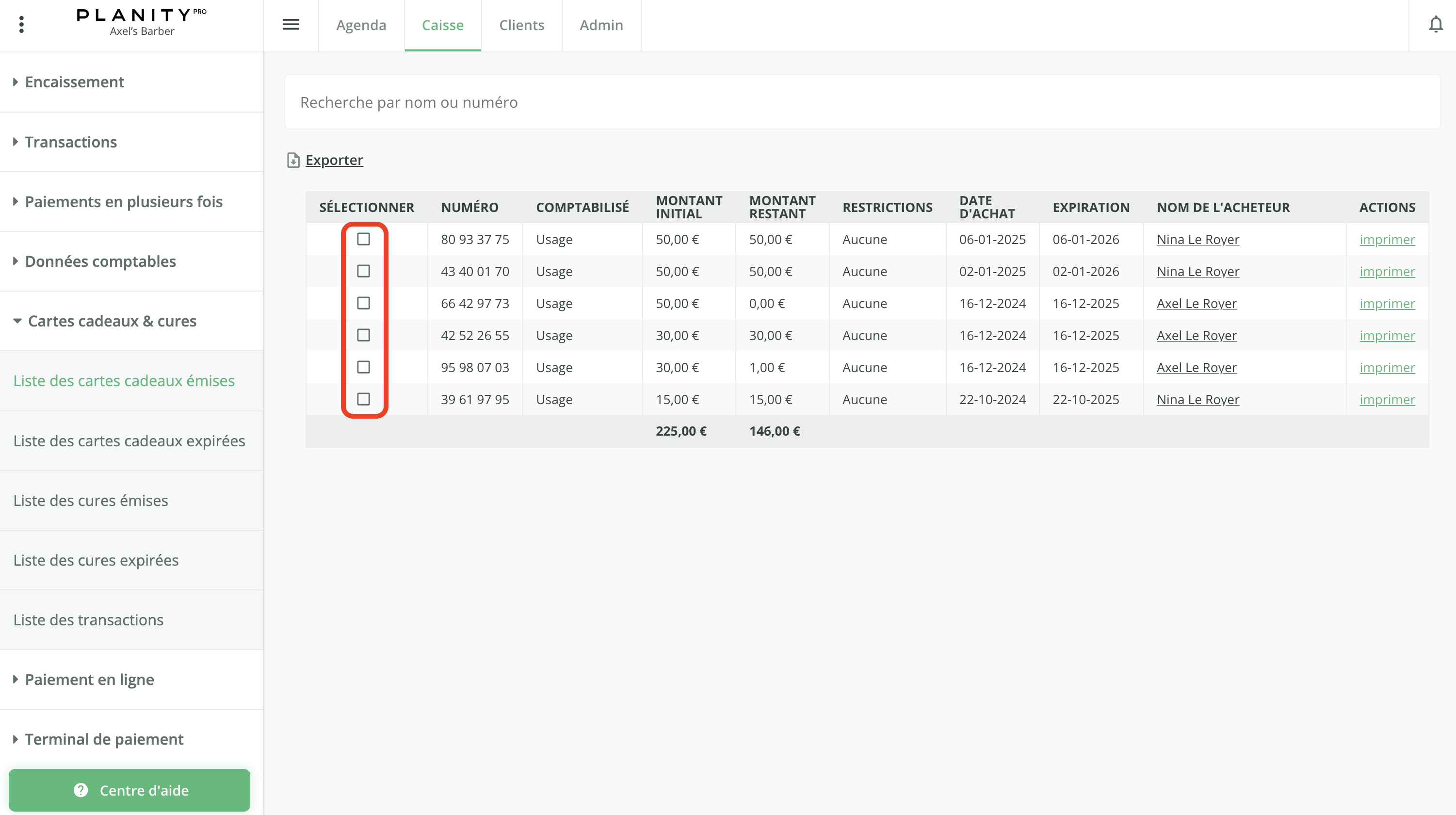 - Cliquez sur le sous-menu "Liste des cartes cadeaux émises"