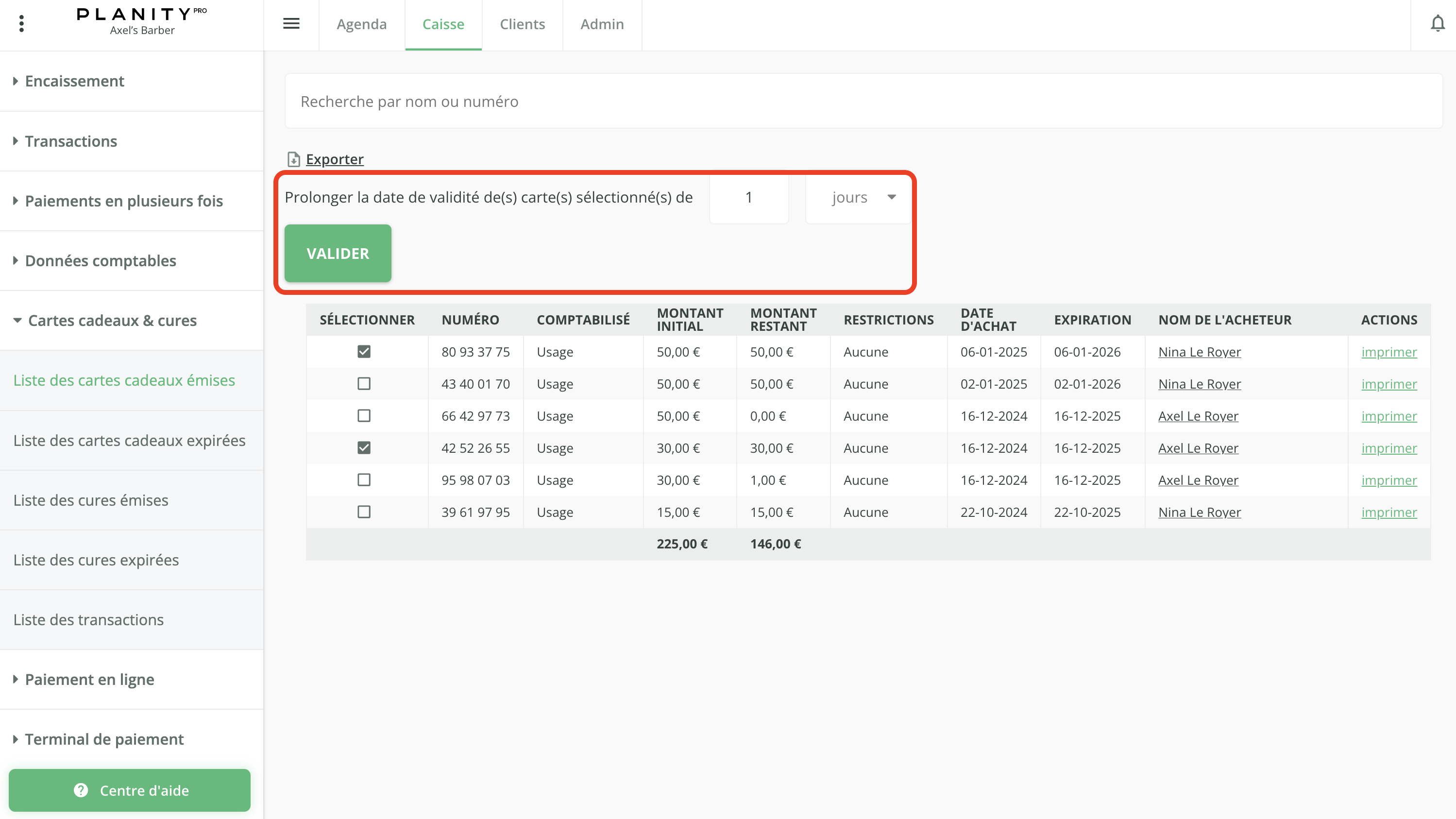 - Sur cet écran, cochez les cartes cadeau que vous souhaitez prolonger.