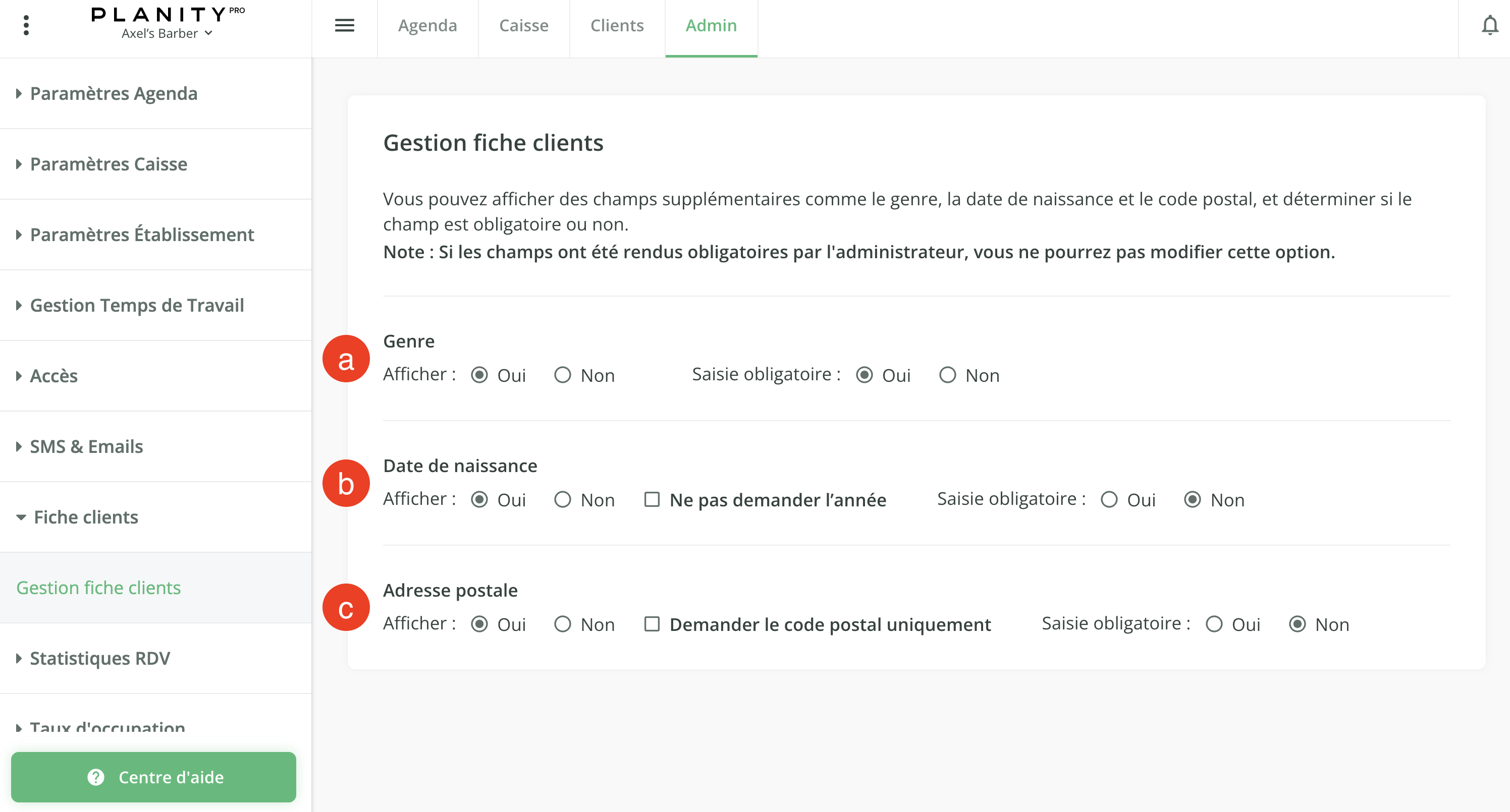 - Pour modifier les informations clients, et définir si leur saisie est obligatoire ou non, cliquez sur Admin.
