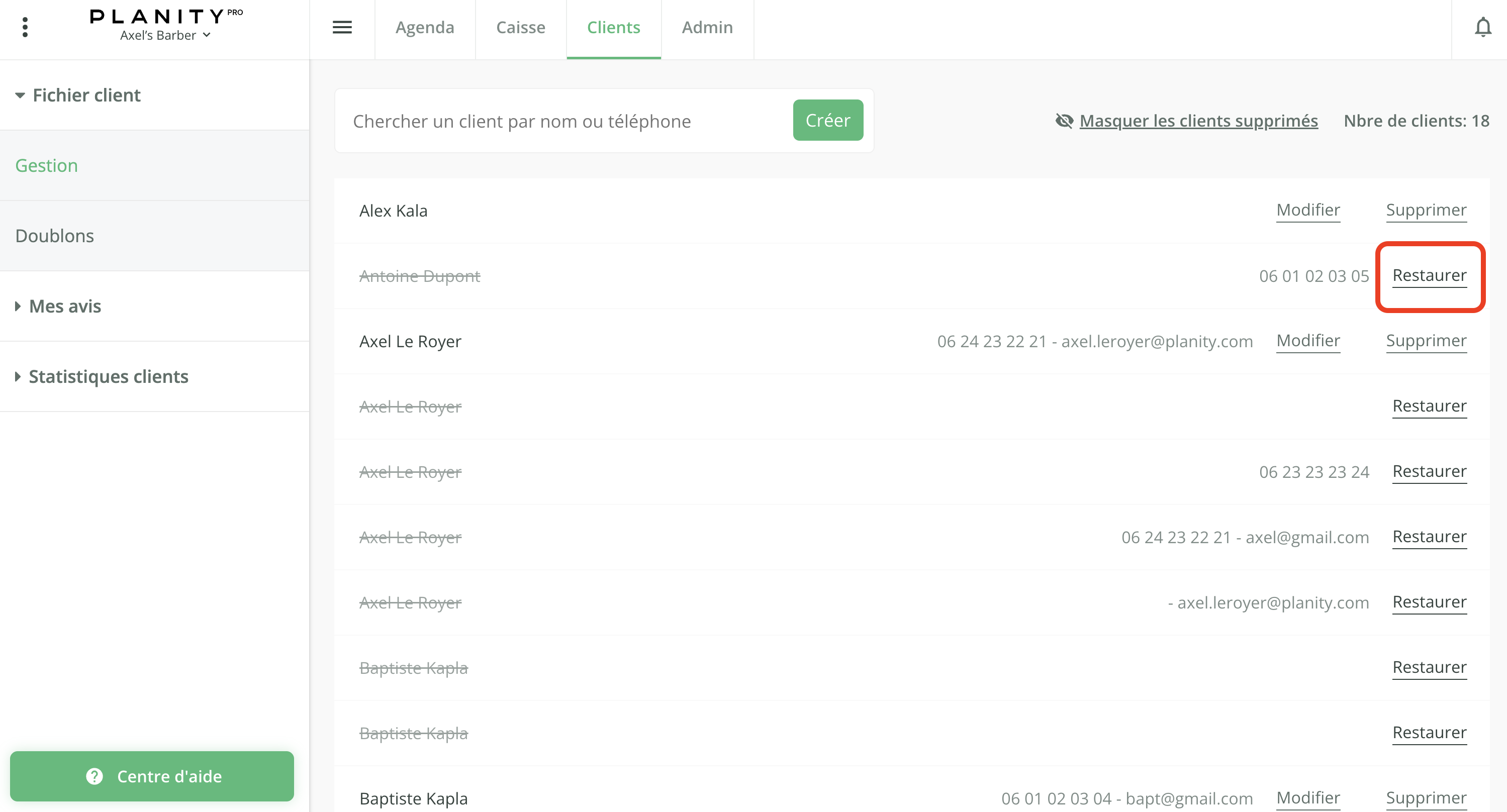 - Cliquez sur Restaurer sur la ligne du client supprimé pour le faire revenir sur votre fichier client.