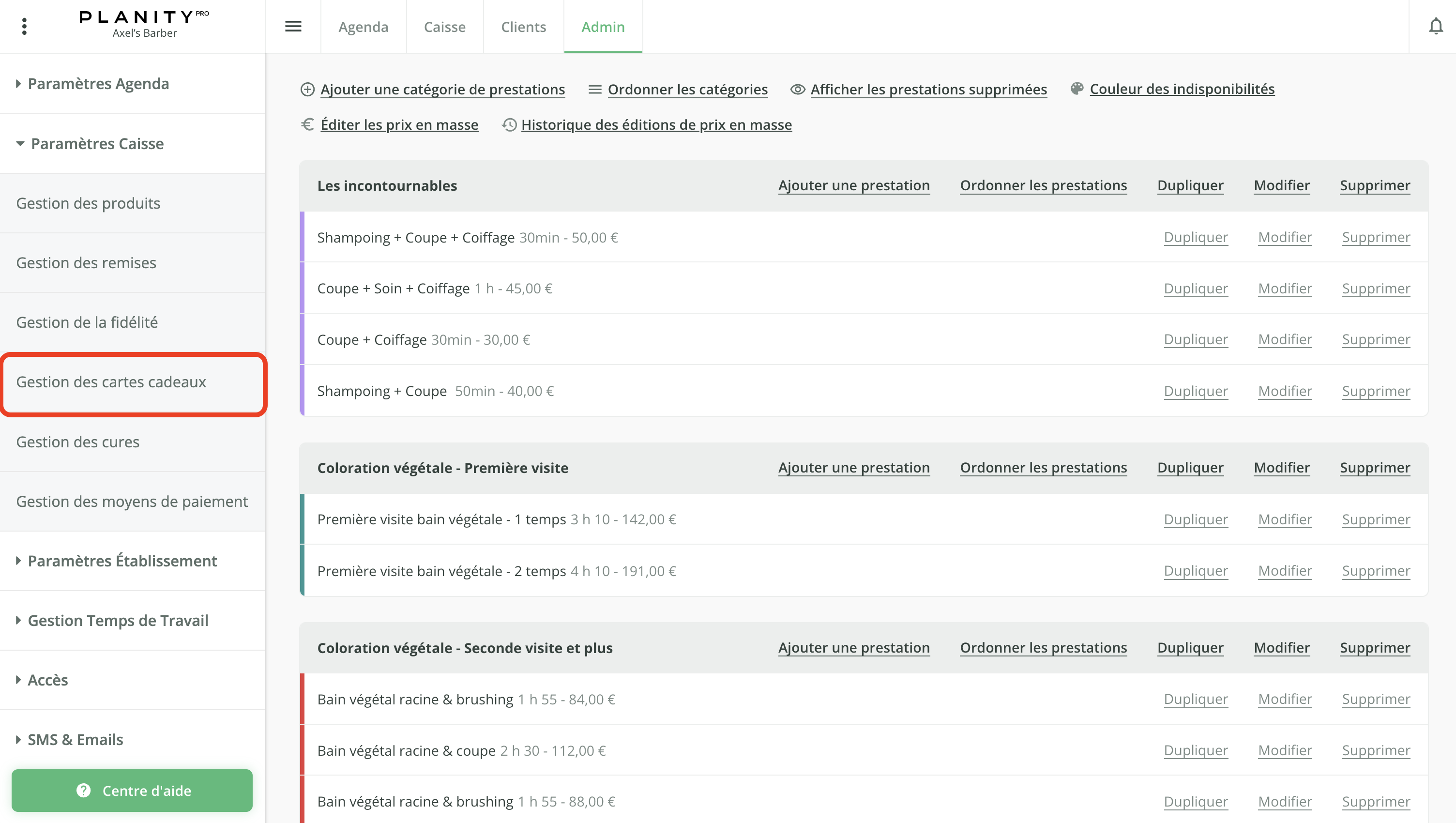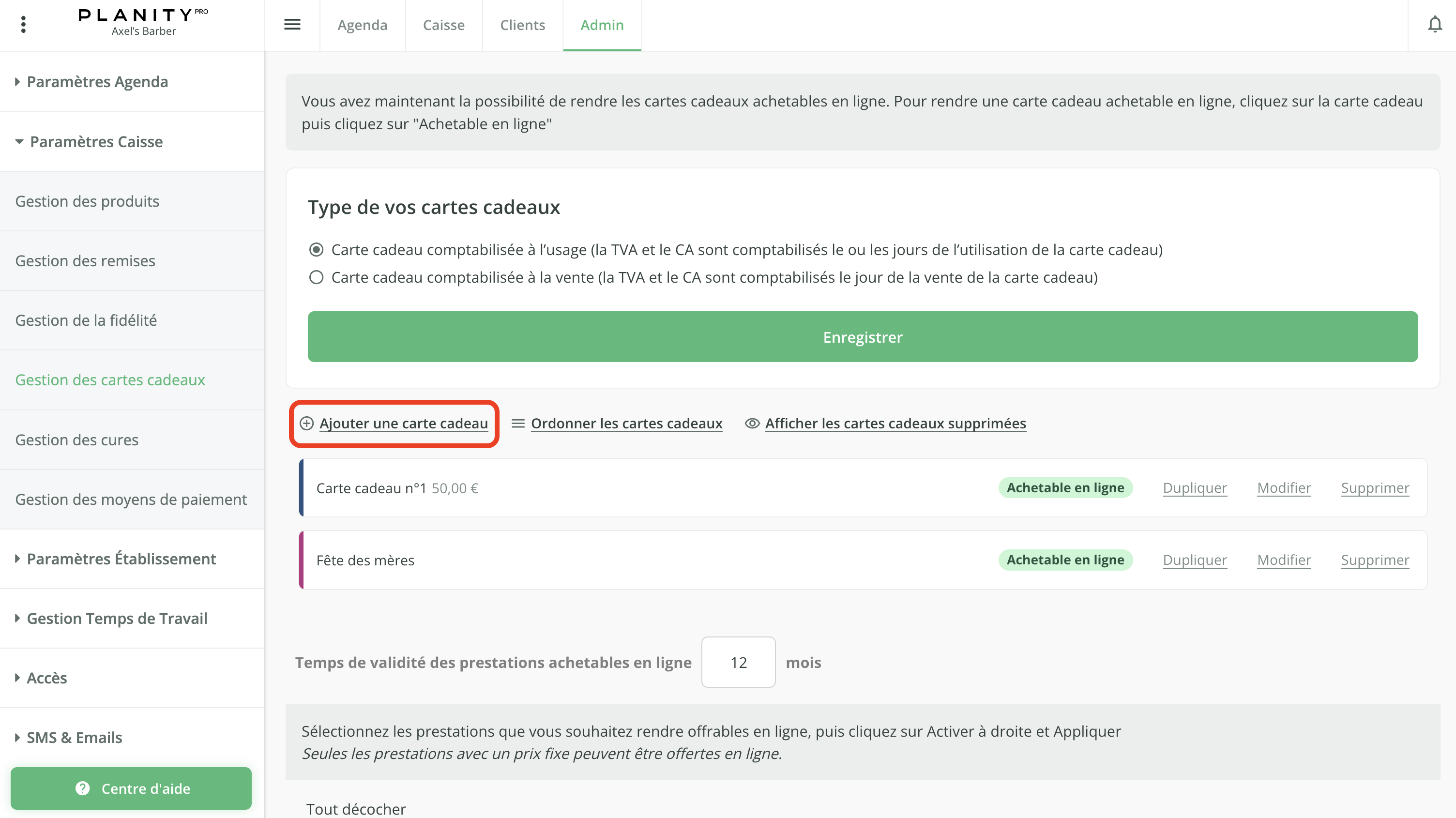 - Pour ajouter une carte cadeau disponible lors de l'encaissement ou à la vente en ligne, cliquez sur Admin.