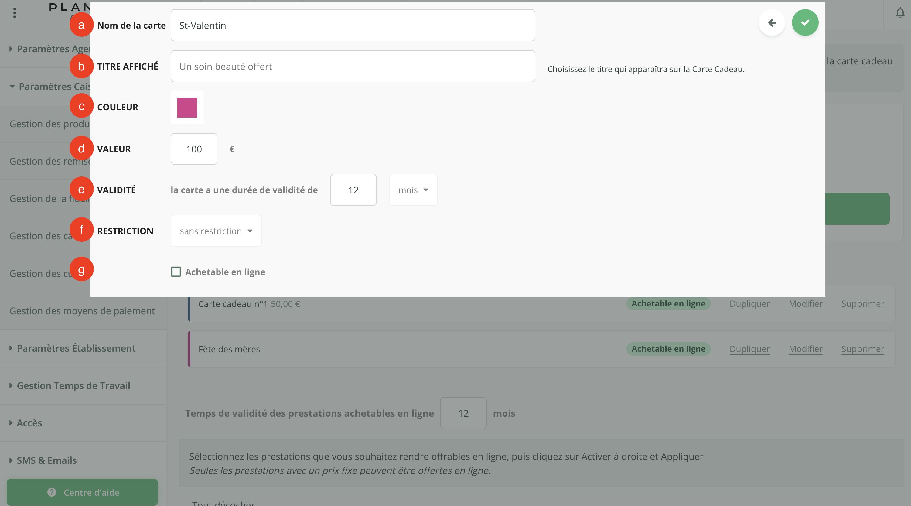 - Si vous souhaitez restreindre l’usage de la carte cadeau uniquement à l'achat de produits ou au règlement de prestations, vous pouvez appliquer une restriction.