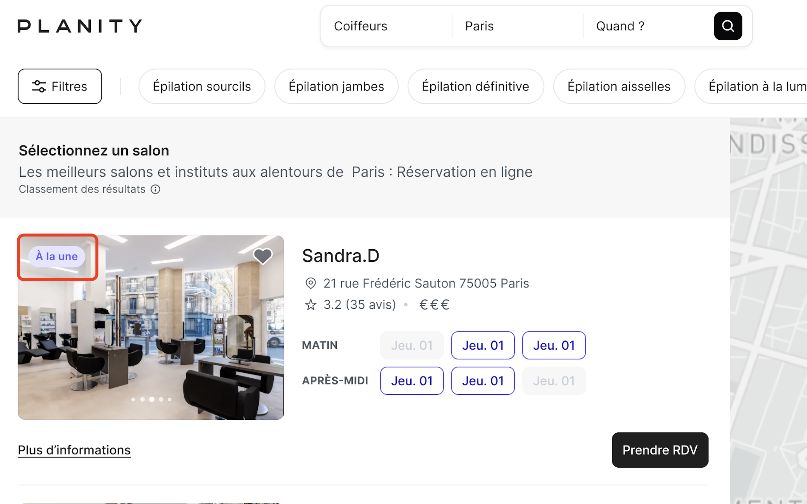 En souscrivant à Planity Ads, votre établissement peut apparaître en tête des résultats pour des recherches précises, comme par exemple « coiffure Paris » ou « institut de beauté Toulouse ».