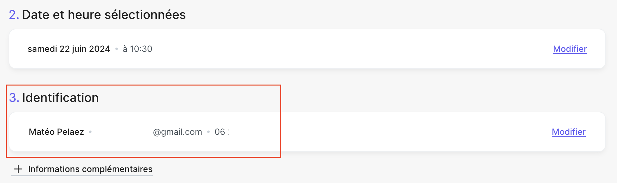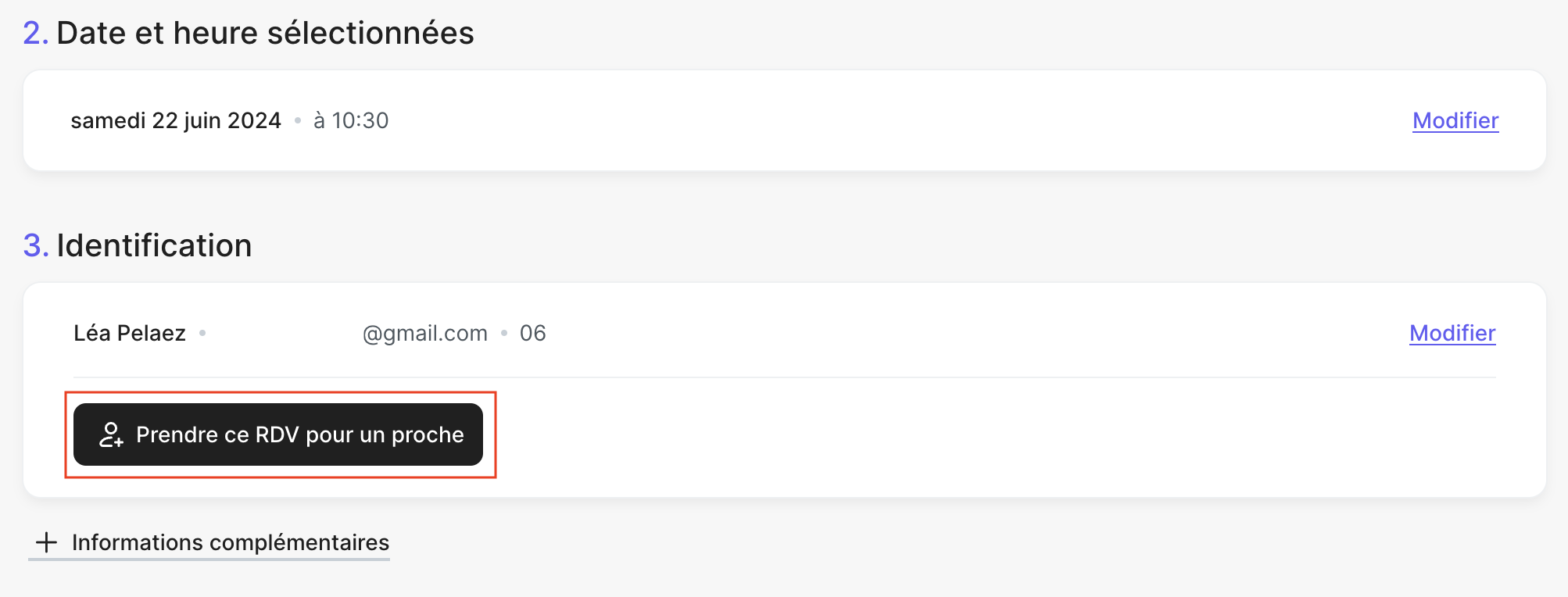 Les informations (Nom, prénom, email et téléphone portable) du proche s'affichent dans la partie Identification sur la page de prise de rendez-vous.