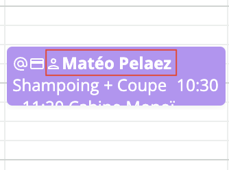 Sur l'agenda on peut voir le prénom et le nom du proche pour lequel le client a pris rendez-vous. Le symbole "Nouveau client" s'affiche également lorsque le client prend pour la première fois rendez-vous pour son proche.