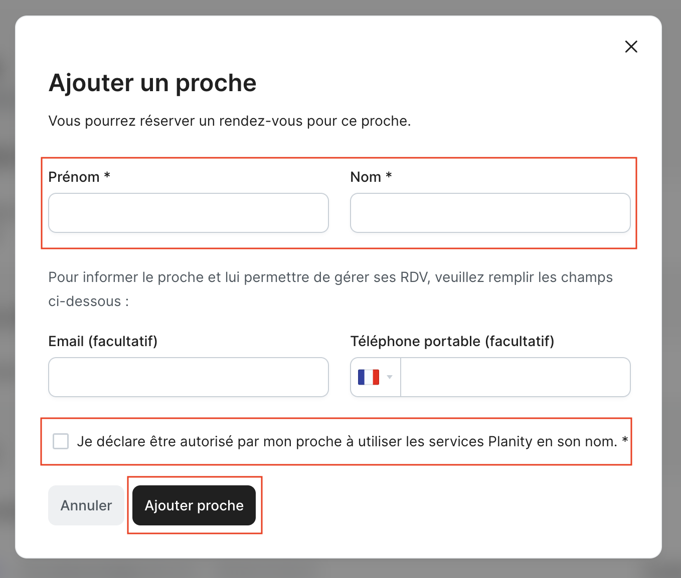 La personne qui prend le rendez-vous (que l'on appellera le client) doit renseigner les informations du proche et déclarer être autorisé à utiliser les services Planity en son nom.