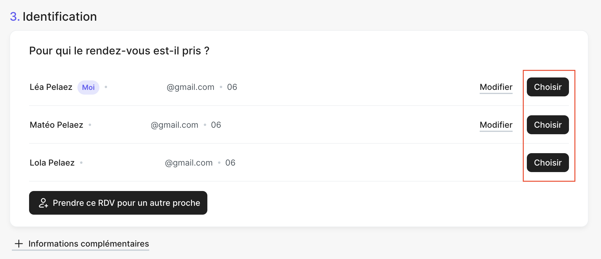 Lorsque le client ajoute plusieurs proches, il doit sélectionner celui pour qui il souhaite prendre rendez-vous en cliquant sur le bouton Choisir.