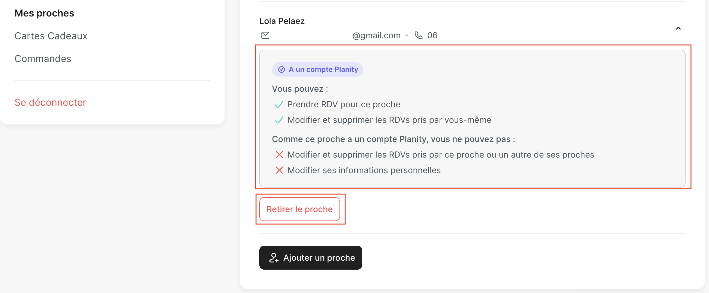 - Si le proche possède un compte Planity, alors les droits du client sur celui-ci sont limités. En effet, le client ne peut pas modifier ou supprimer les rendez-vous pris par ce proche ou par un autre de ses proches. Il est également impossible pour le client de modifier les informations personnelles de son proche.