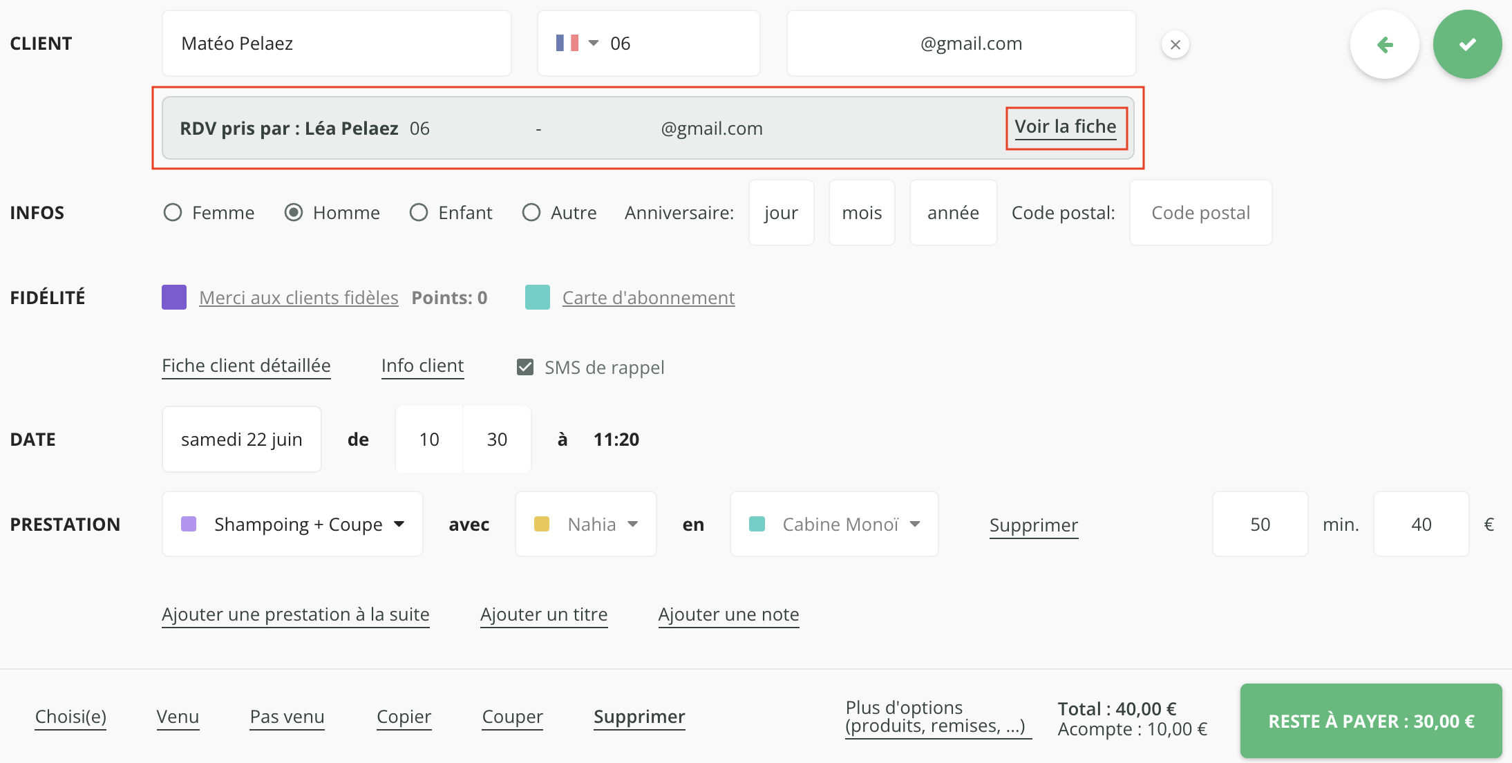 Lorsqu'un client prend rendez-vous pour un proche, une nouvelle fiche client est créée pour le proche. Les informations personnelles du client (Nom, prénom, téléphone portable et email) s'affichent au niveau du rendez-vous. Le bouton Voir la fiche permet d'être redirigé sur la fiche client du client ayant pris le rendez-vous.