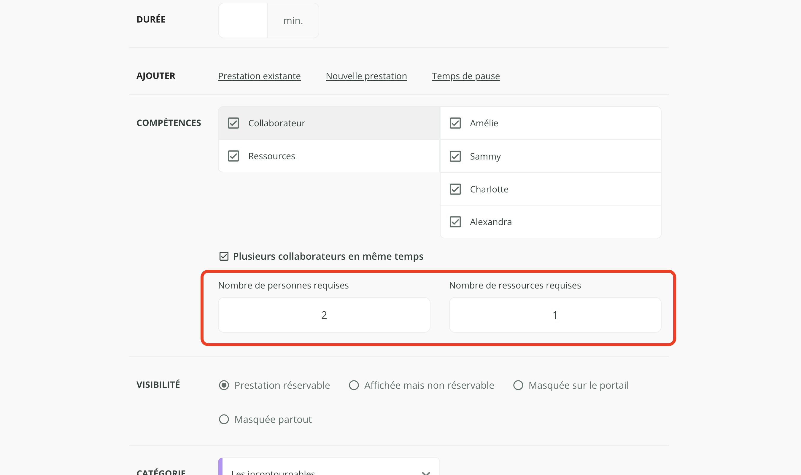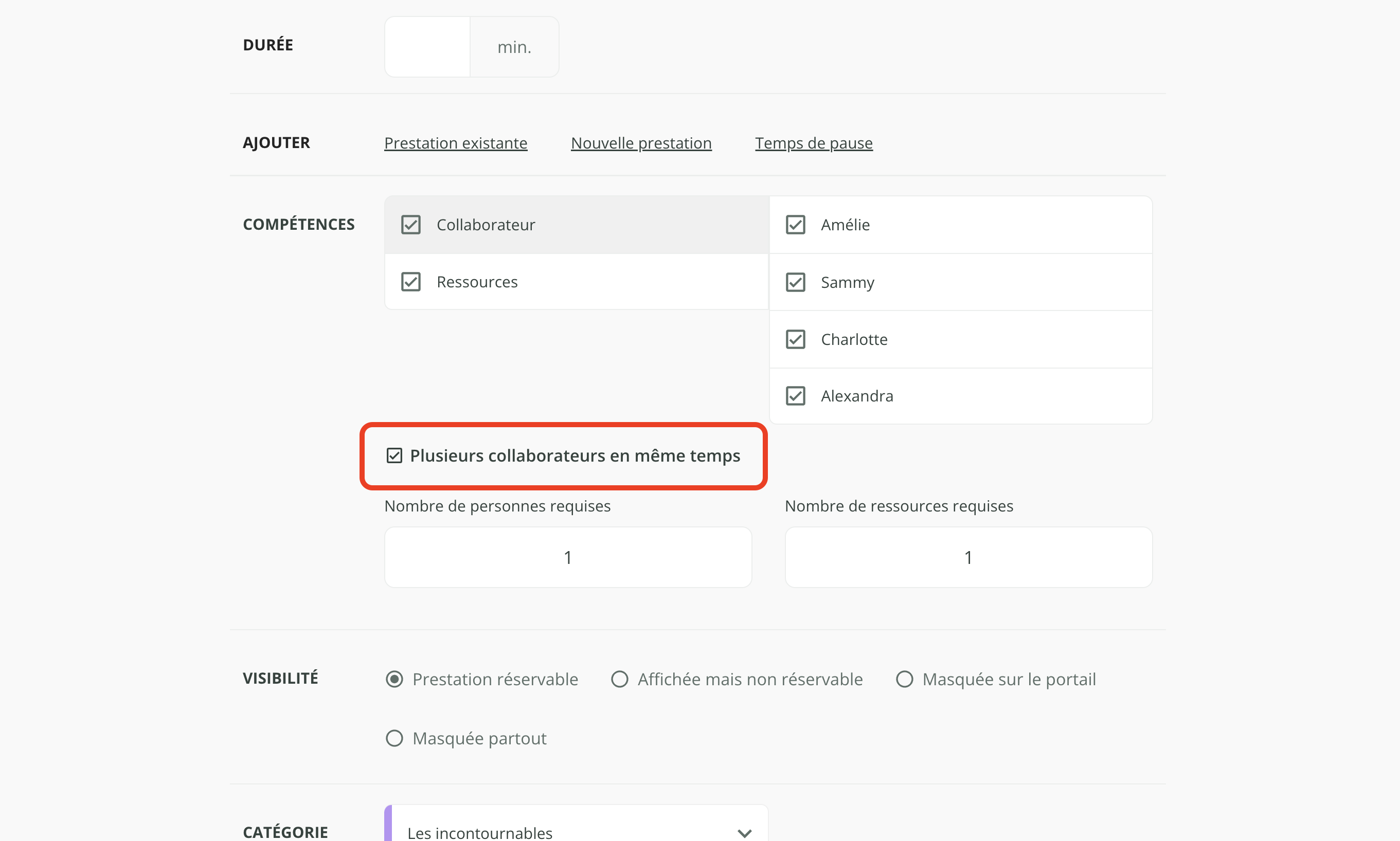 - Sur la prestation, cochez la case Plusieurs collaborateurs en même temps dans la partie Compétences.