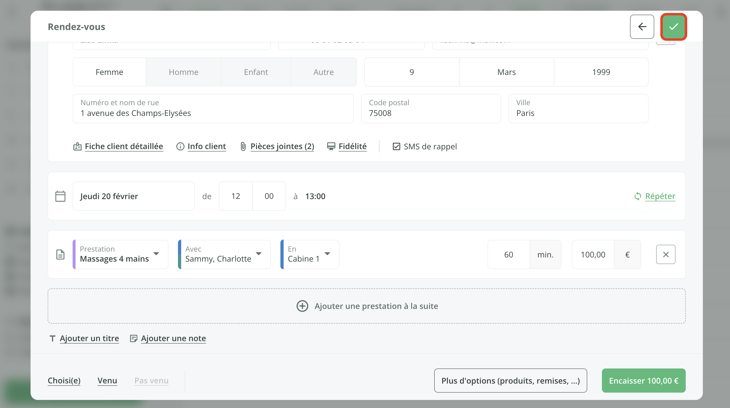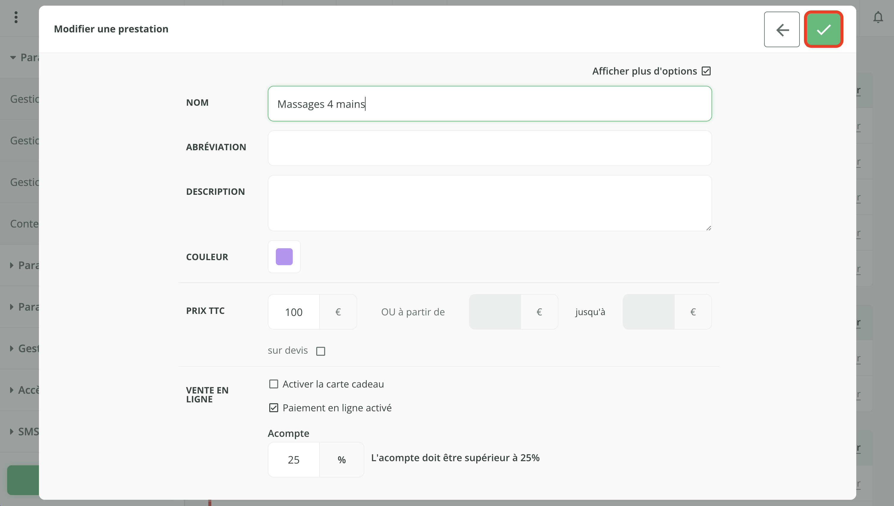 - Remplissez tous les autres paramètres de votre prestation, puis cliquez en haut à droite pour enregistrer la prestation.