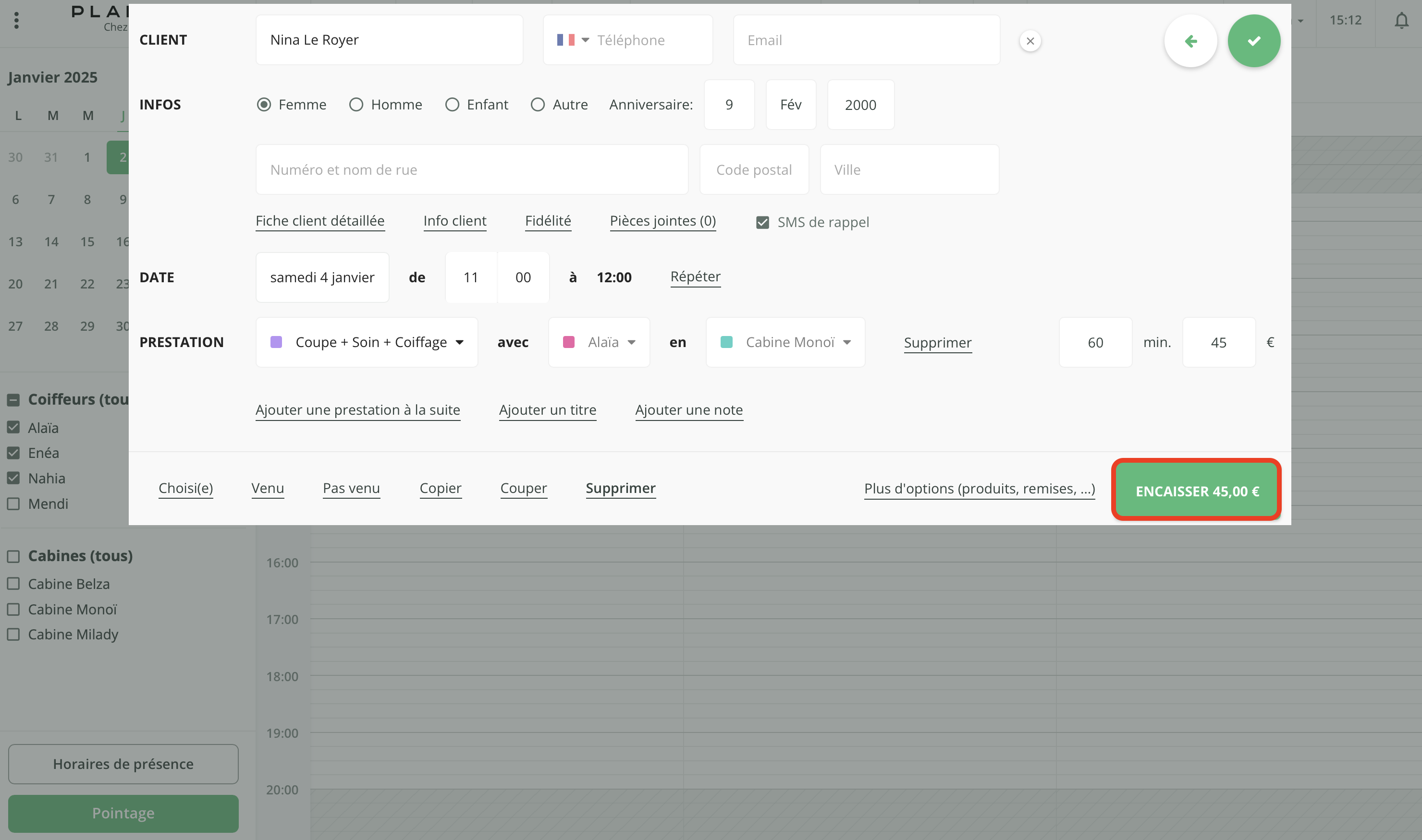 - Sur le rendez-vous que vous souhaitez encaisser, cliquez sur "Encaisser" en bas à droite de votre écran